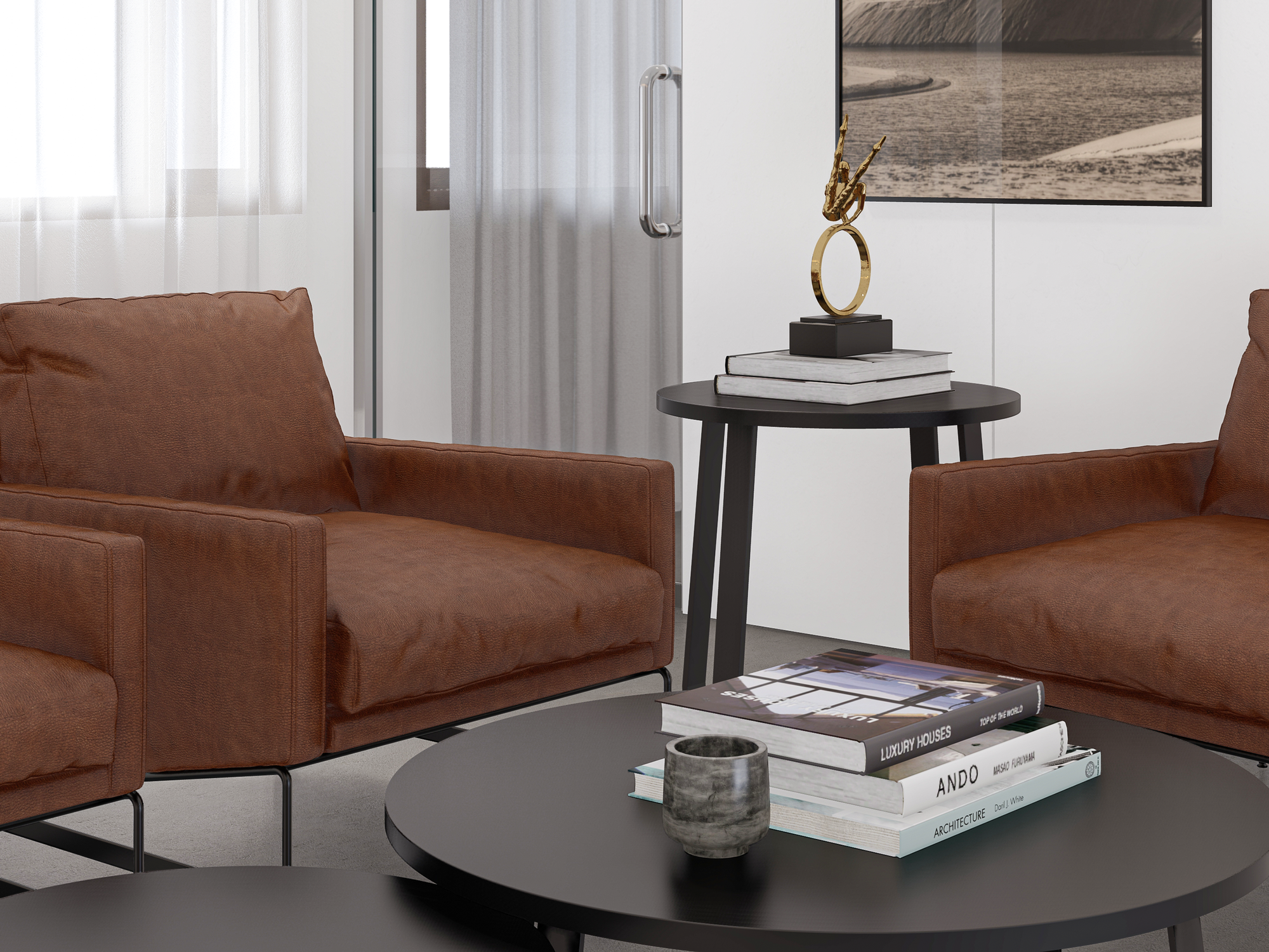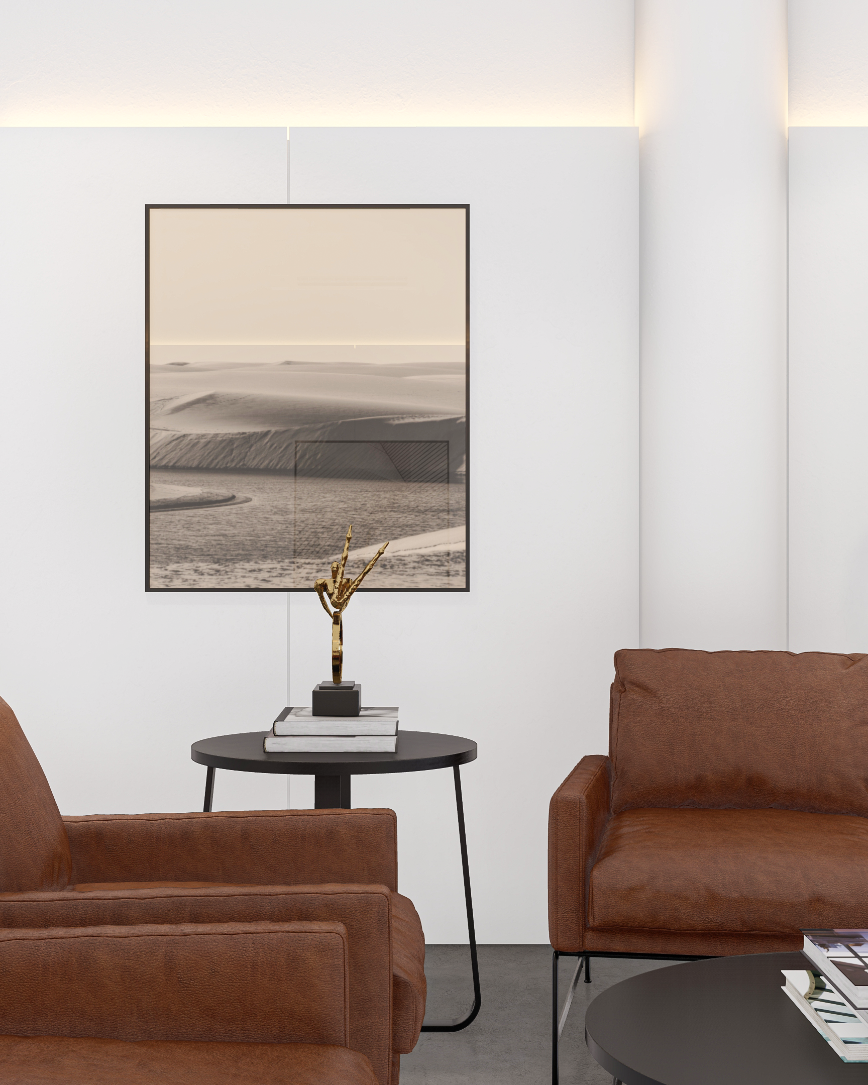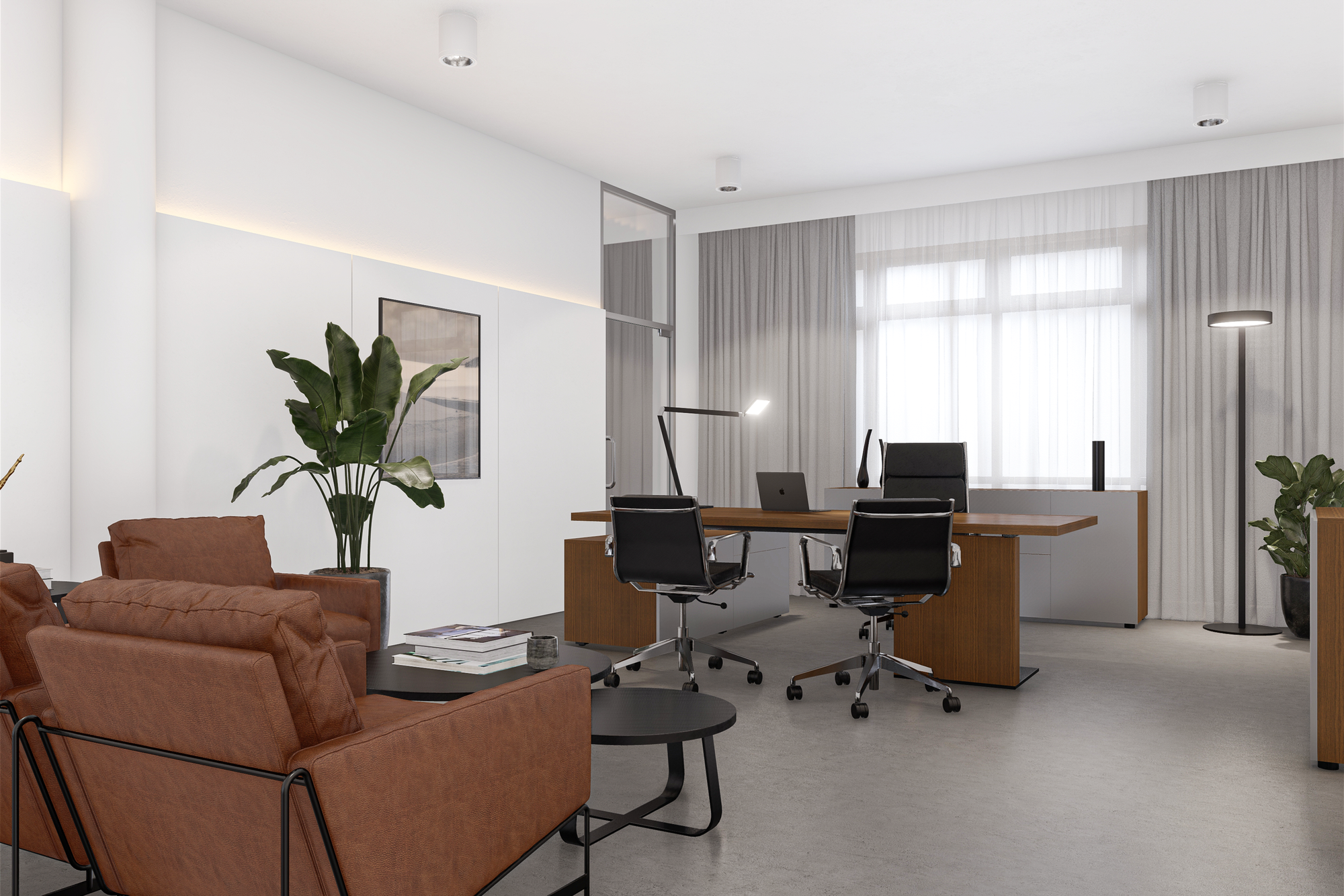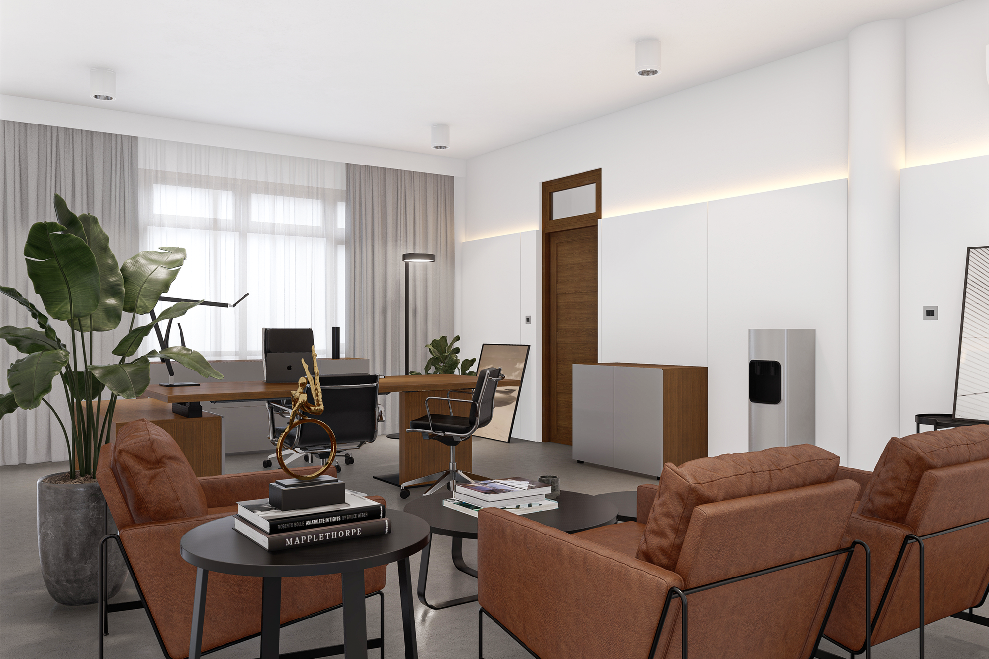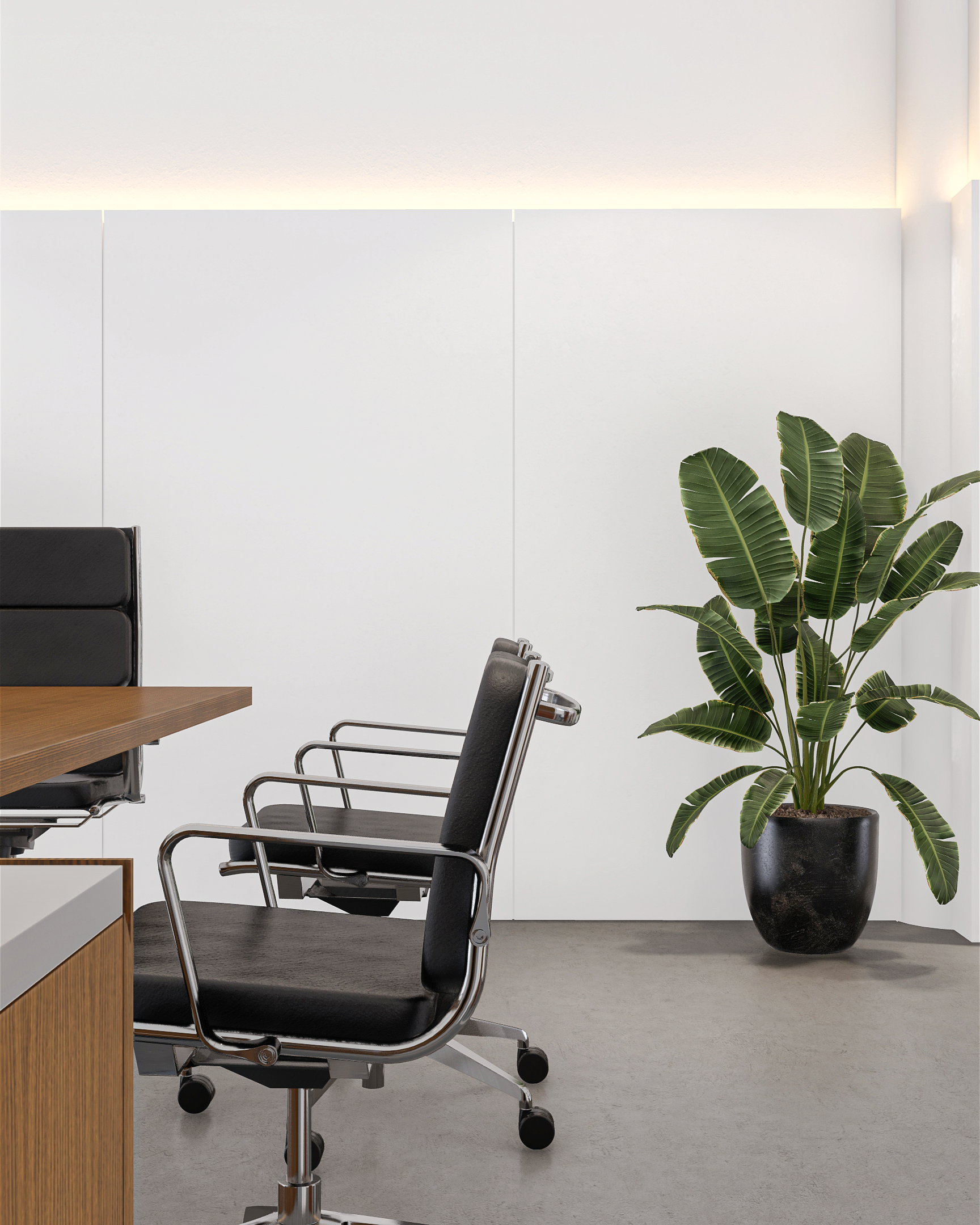 Proyek ini dibangun di atas prinsip utama keterhubungan, baik secara fungsional antara tiga zona utama (ruang kerja, ruang rapat, dan area lounge tamu), maupun secara emosional melalui pendekatan estetika yang mengedepankan kenyamanan, kehangatan, dan kejelasan visual. Tanpa melupakan kebutuhan akan privasi, ketiga zona ini diatur secara terbuka namun terkendali, dihubungkan oleh partisi kaca transparan berbingkai ramping yang menyaring batas secara halus.