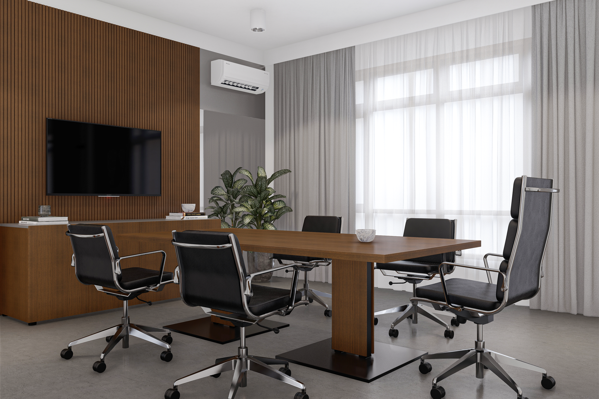 Material yang dipilih pun tak kalah penting dalam membangun narasi ruang. Kayu dengan tekstur yang halus pada meja dan panel-panel cabinetry menghadirkan sentuhan alami yang ramah, sementara penggunaan logam dan kulit sintetis pada kursi kerja memberikan sentuhan modern-industrial yang tangguh namun tetap nyaman. Permukaan lantai dengan beton polished memperkuat visual dan nuansa kontemporer sekaligus fungsional untuk perawatan jangka panjang.