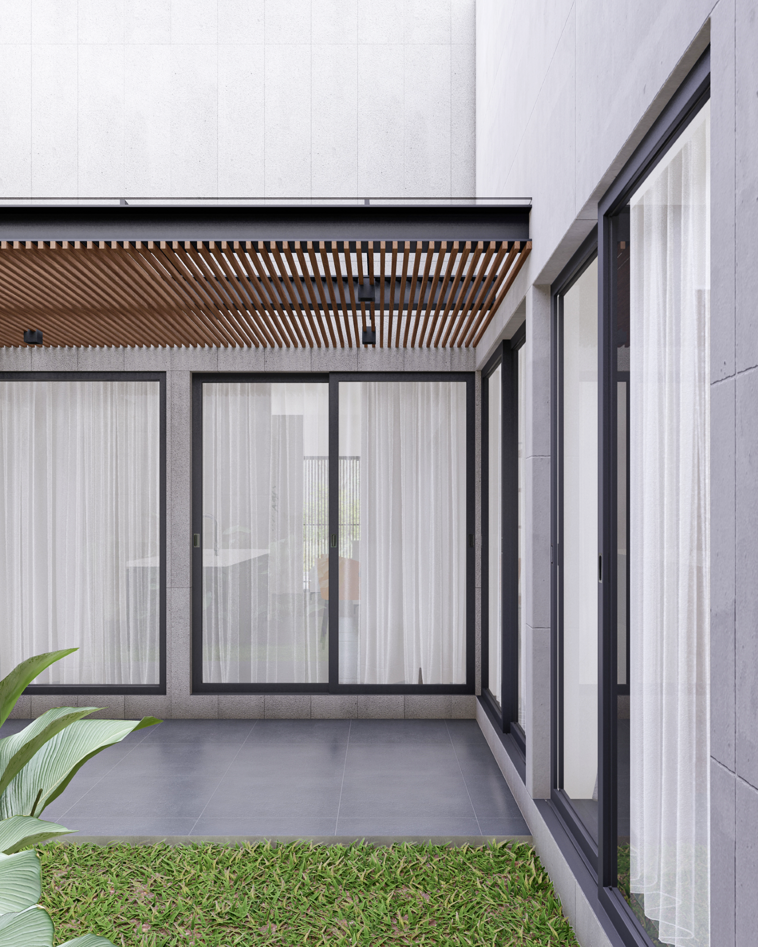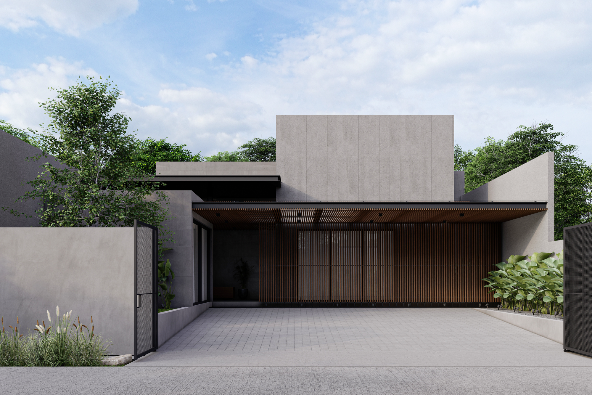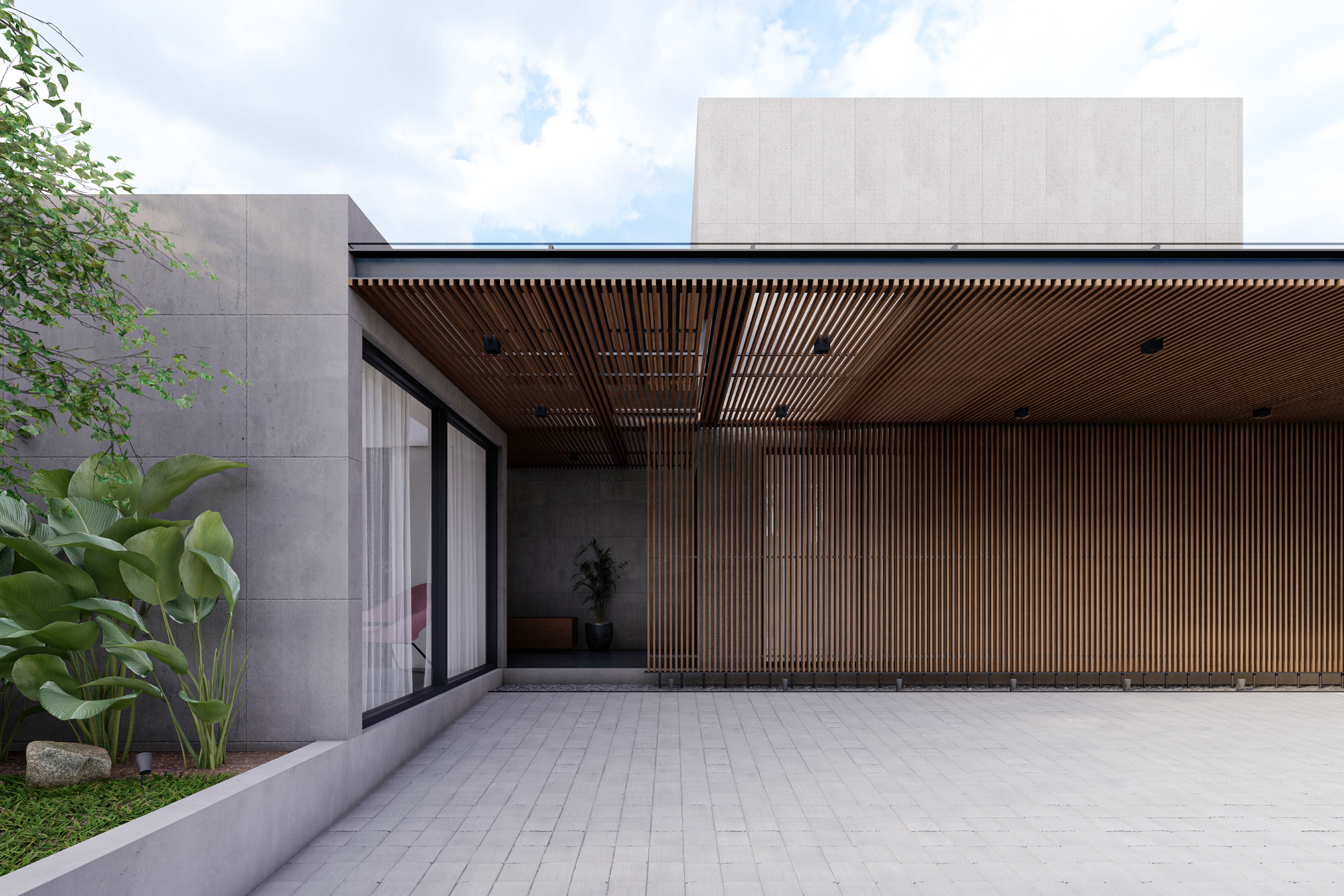 Fasad depan rumah menampilkan komposisi massa geometris sederhana dengan permainan bidang beton ekspos dan elemen kayu sebagai aksen utama. Bidang-bidang solid disusun secara horizontal dan vertikal untuk membentuk kesan kokoh sekaligus modern. Keberadaan secondary skin berupa bilah kayu vertikal tidak hanya berfungsi estetis, tetapi juga sebagai elemen penyaring cahaya dan privasi dari arah jalan.