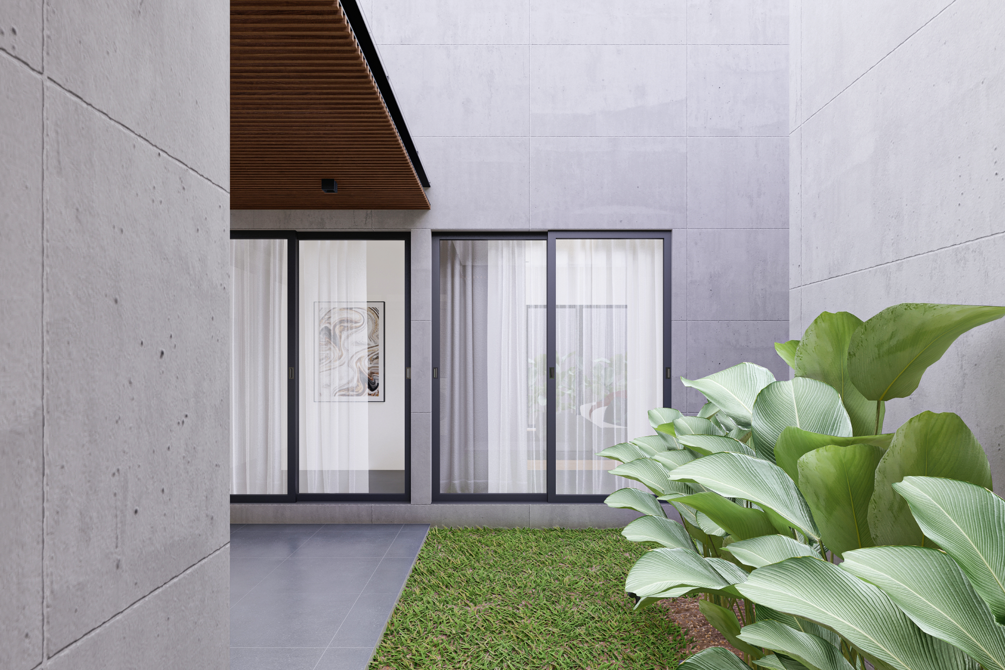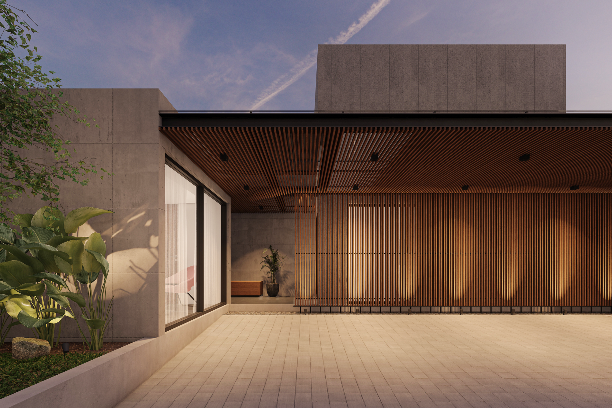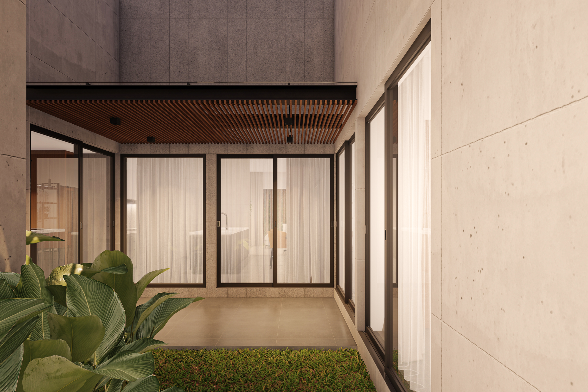 Fasad depan rumah menampilkan komposisi massa geometris sederhana dengan permainan bidang beton ekspos dan elemen kayu sebagai aksen utama. Bidang-bidang solid disusun secara horizontal dan vertikal untuk membentuk kesan kokoh sekaligus modern. Keberadaan secondary skin berupa bilah kayu vertikal tidak hanya berfungsi estetis, tetapi juga sebagai elemen penyaring cahaya dan privasi dari arah jalan.