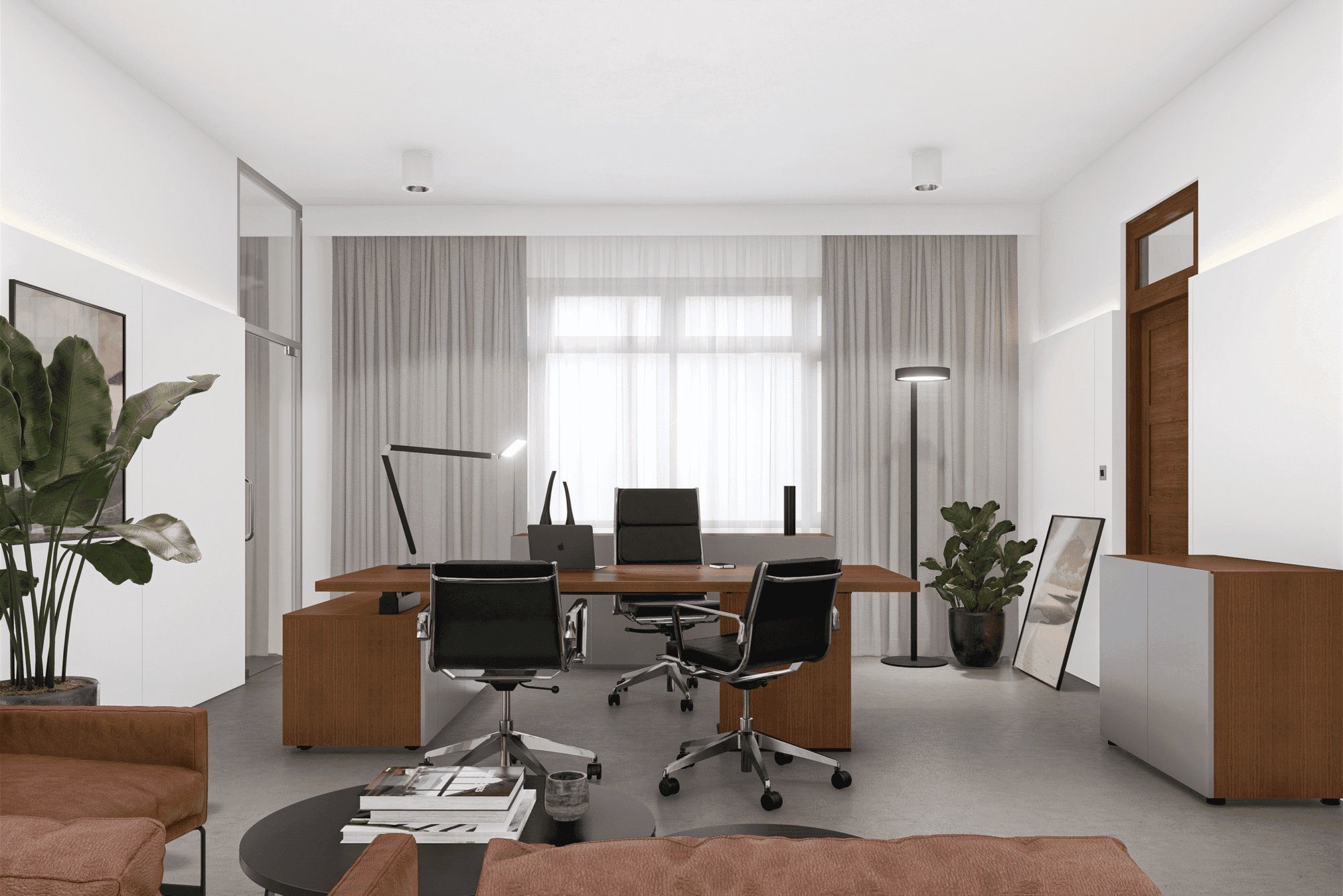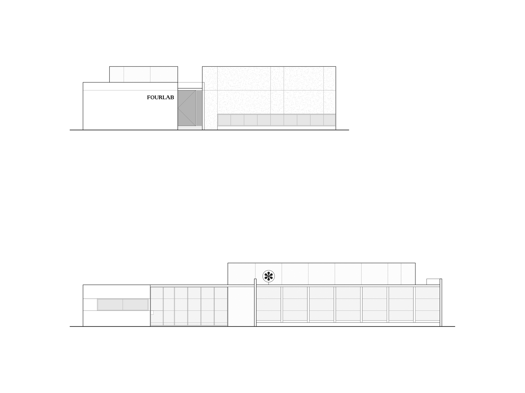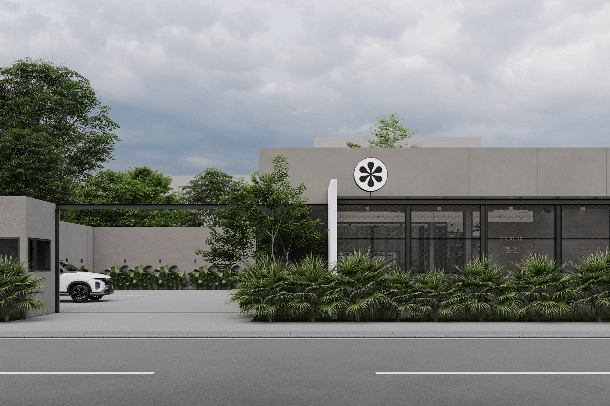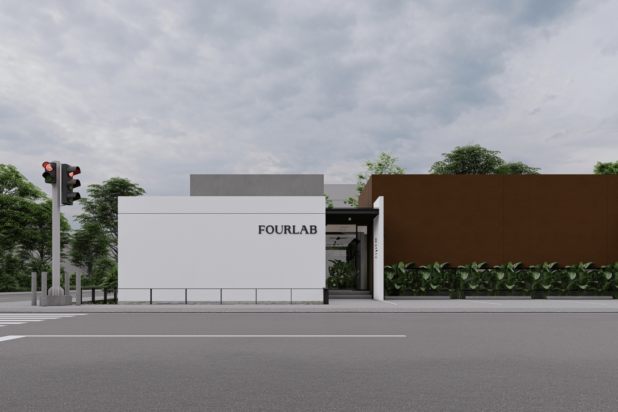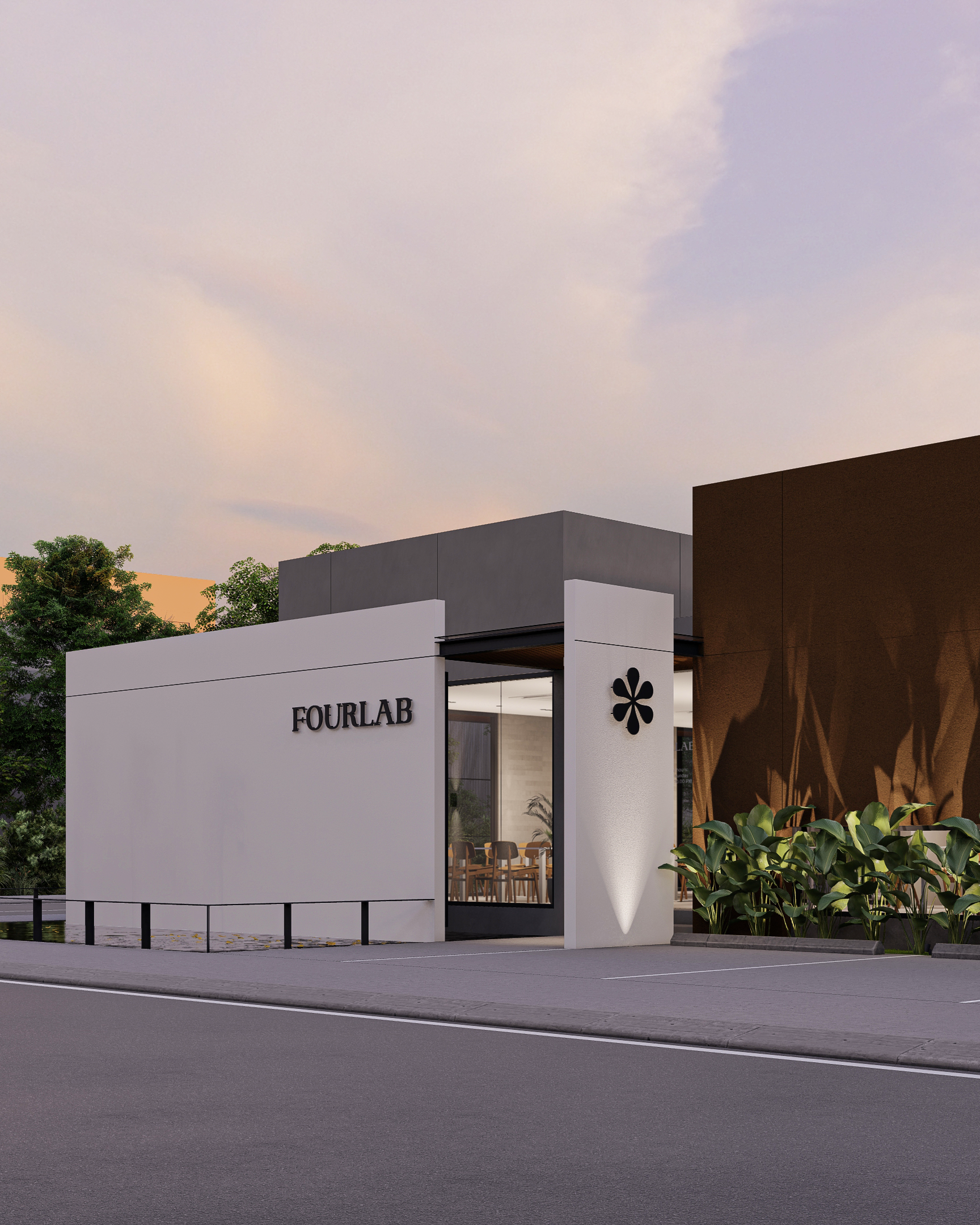 Fasad utama dibentuk oleh komposisi bidang geometris yang tegas. Dinding putih polos tampil sebagai elemen penanda, mem frame logo dan nama Fourlab secara sederhana namun kuat. Di belakangnya, lapisan kedua berupa kaca lebar berbingkai hitam menghadirkan transparansi yang memperlihatkan aktivitas di dalam. Perpaduan ini menciptakan dialog antara solid dan void, antara privasi dan keterbukaan.