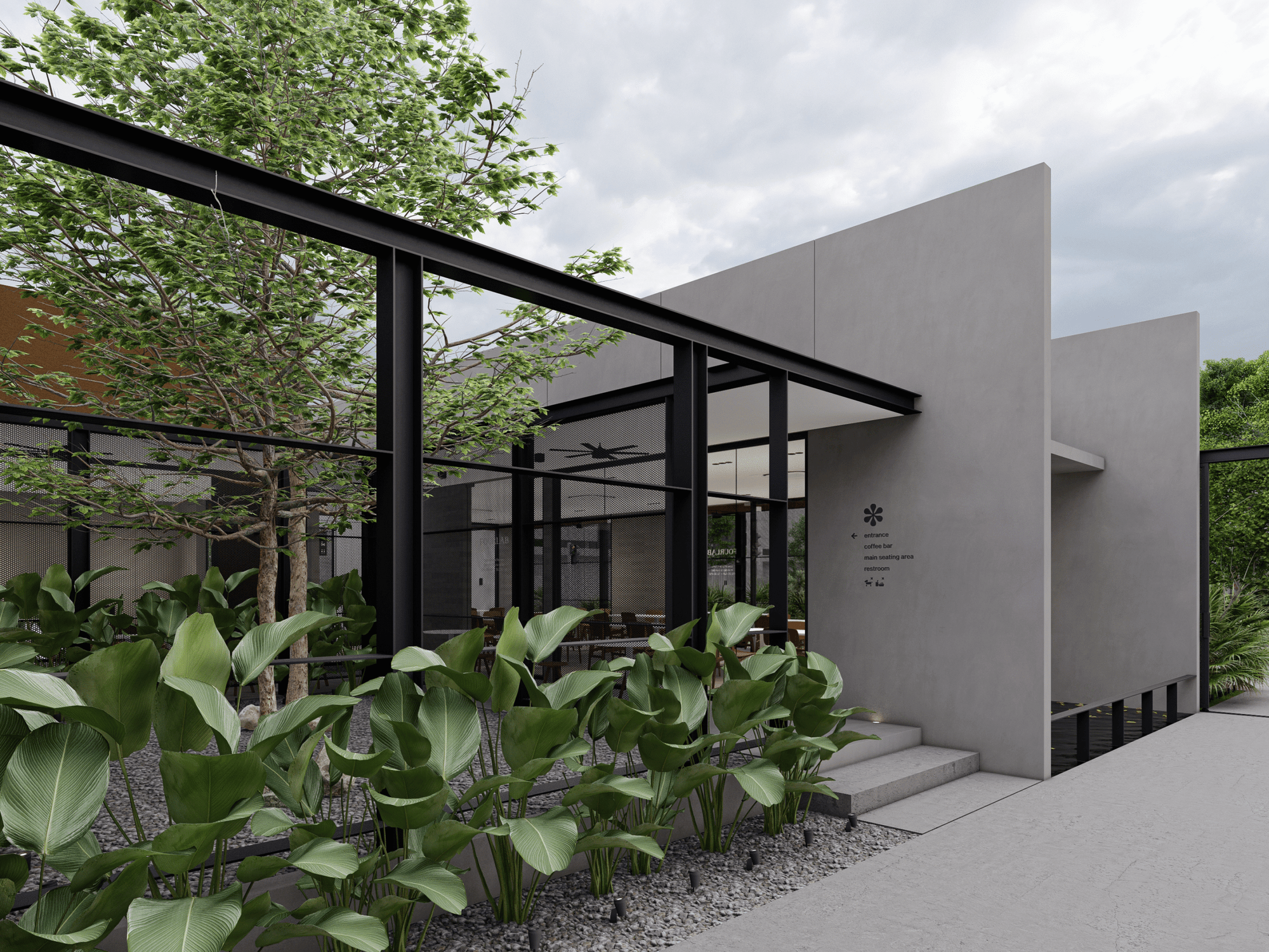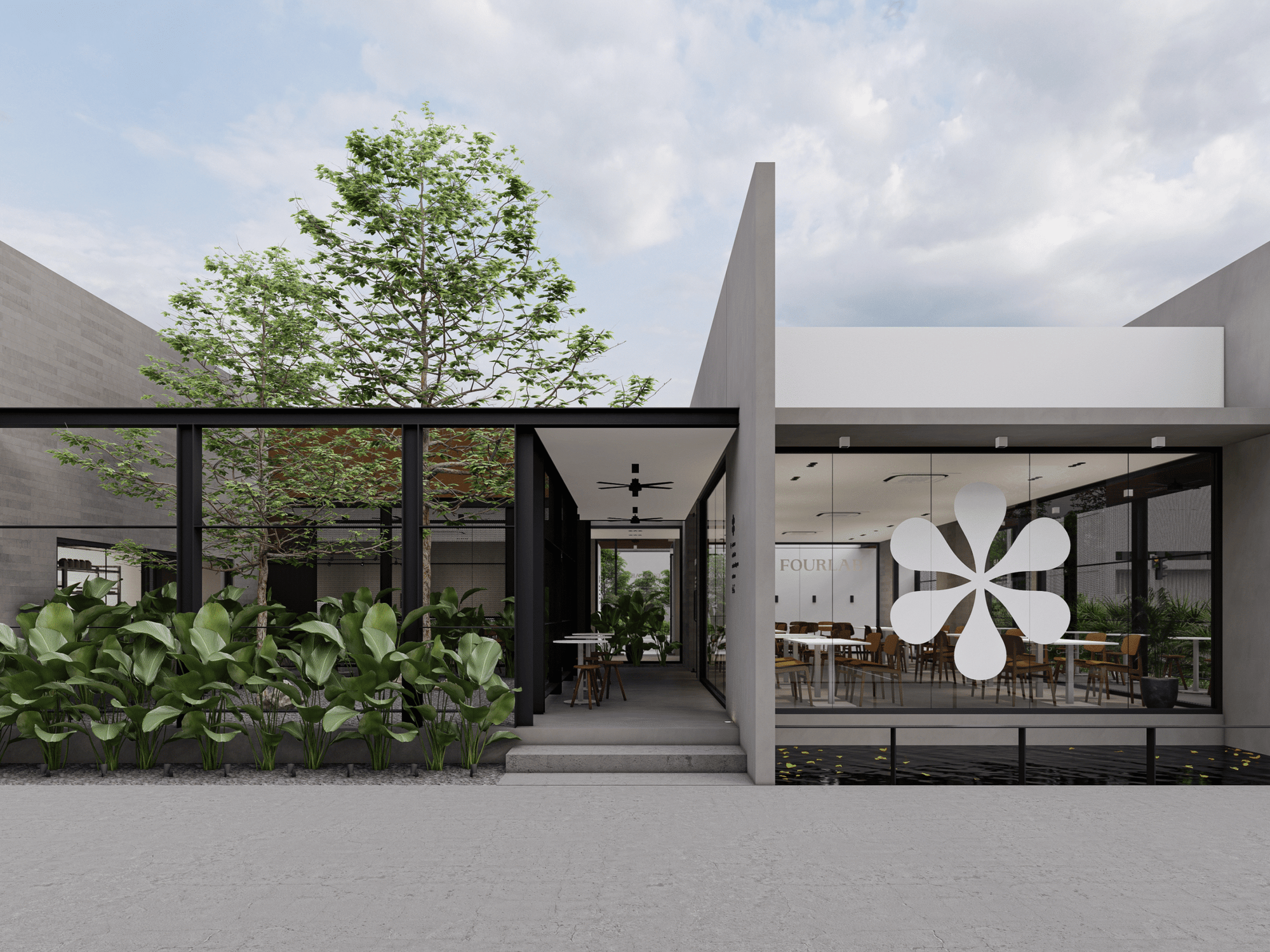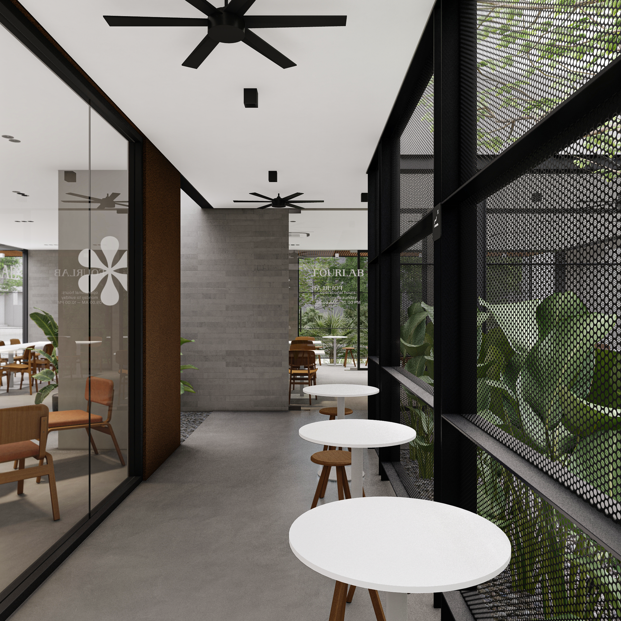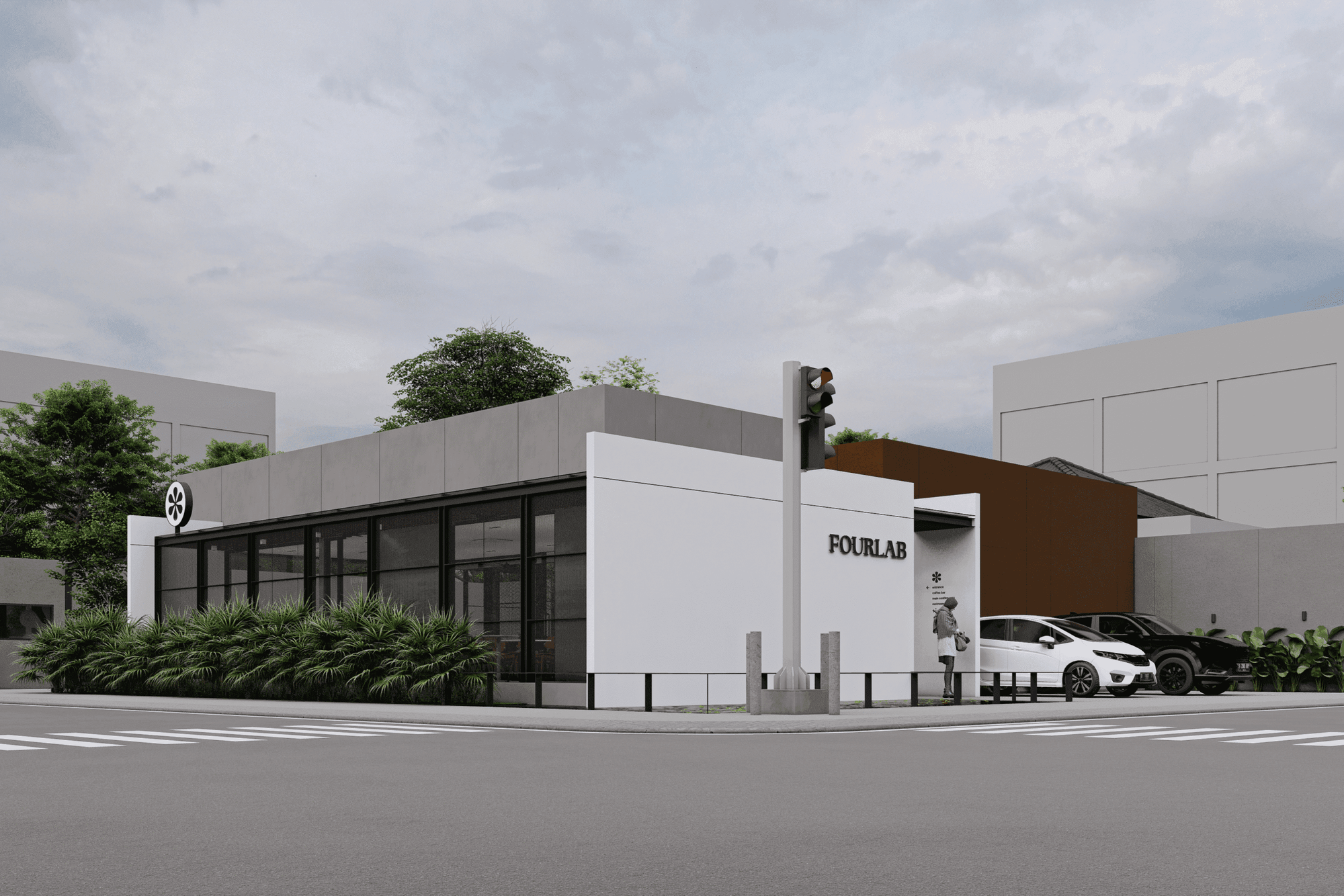 Fourlab dirancang sebagai sebuah ruang kopi kontemporer yang tumbuh dari pertemuan antara kesederhanaan bentuk, kejujuran material, dan kehangatan suasana tropis urban. Terletak di sudut persimpangan jalan, bangunan ini memanfaatkan posisi hook sebagai peluang untuk menghadirkan dua wajah arsitektur yang sama kuatnya, terbuka namun tetap terkontrol. Massa bangunan yang rendah dan horizontal memberi kesan membumi, seolah menyatu dengan ritme kota di sekitarnya tanpa kehilangan identitasnya.