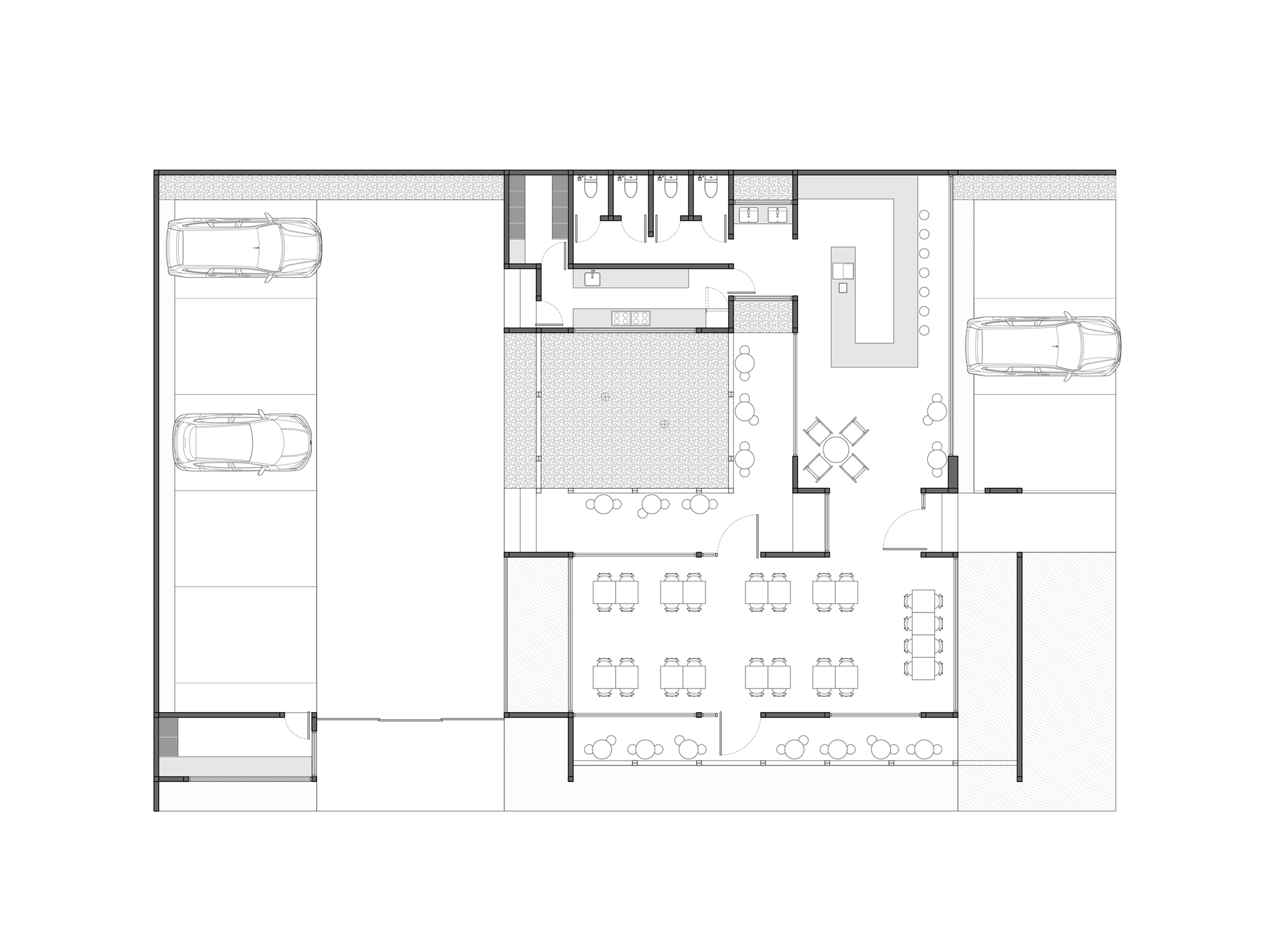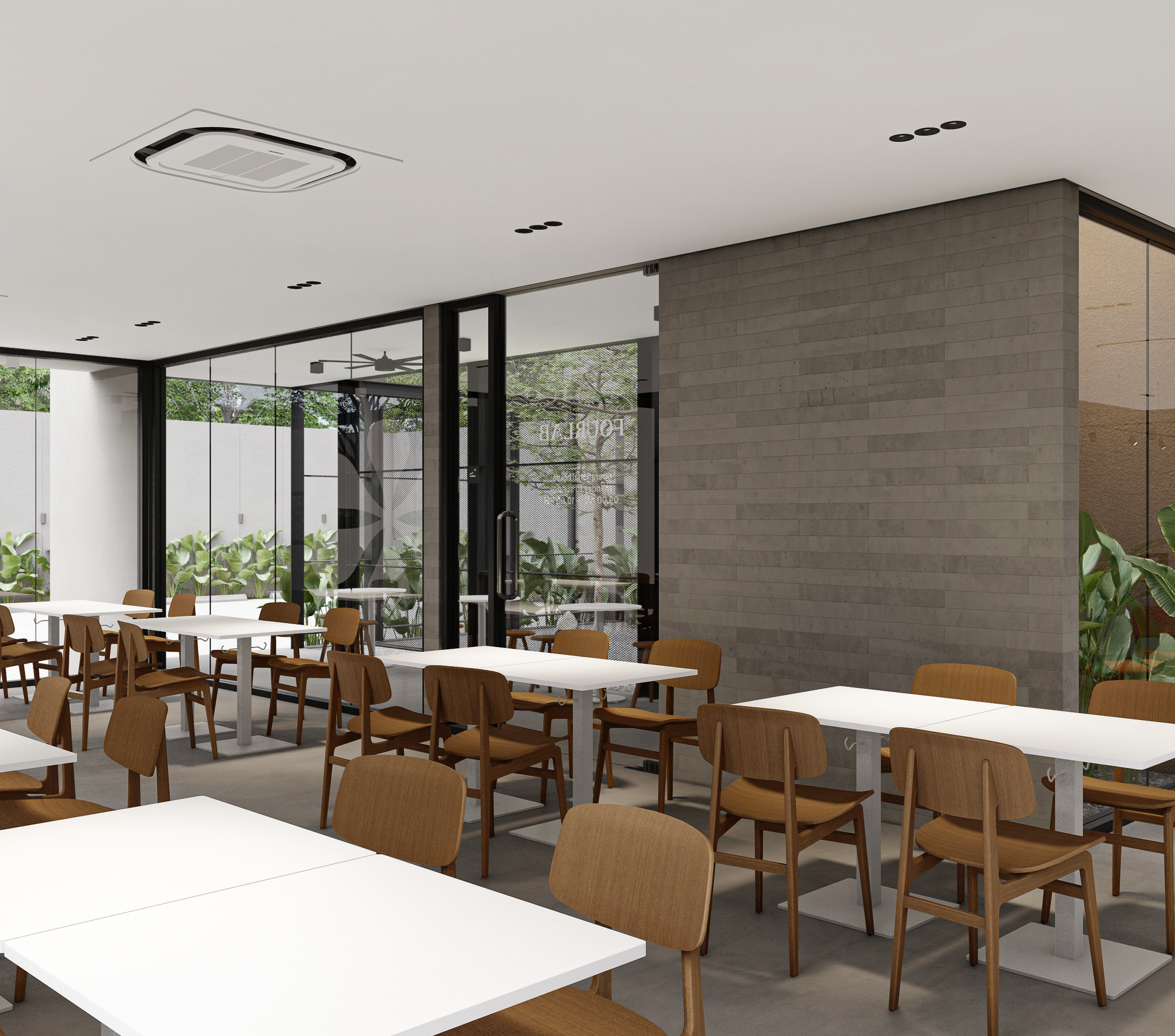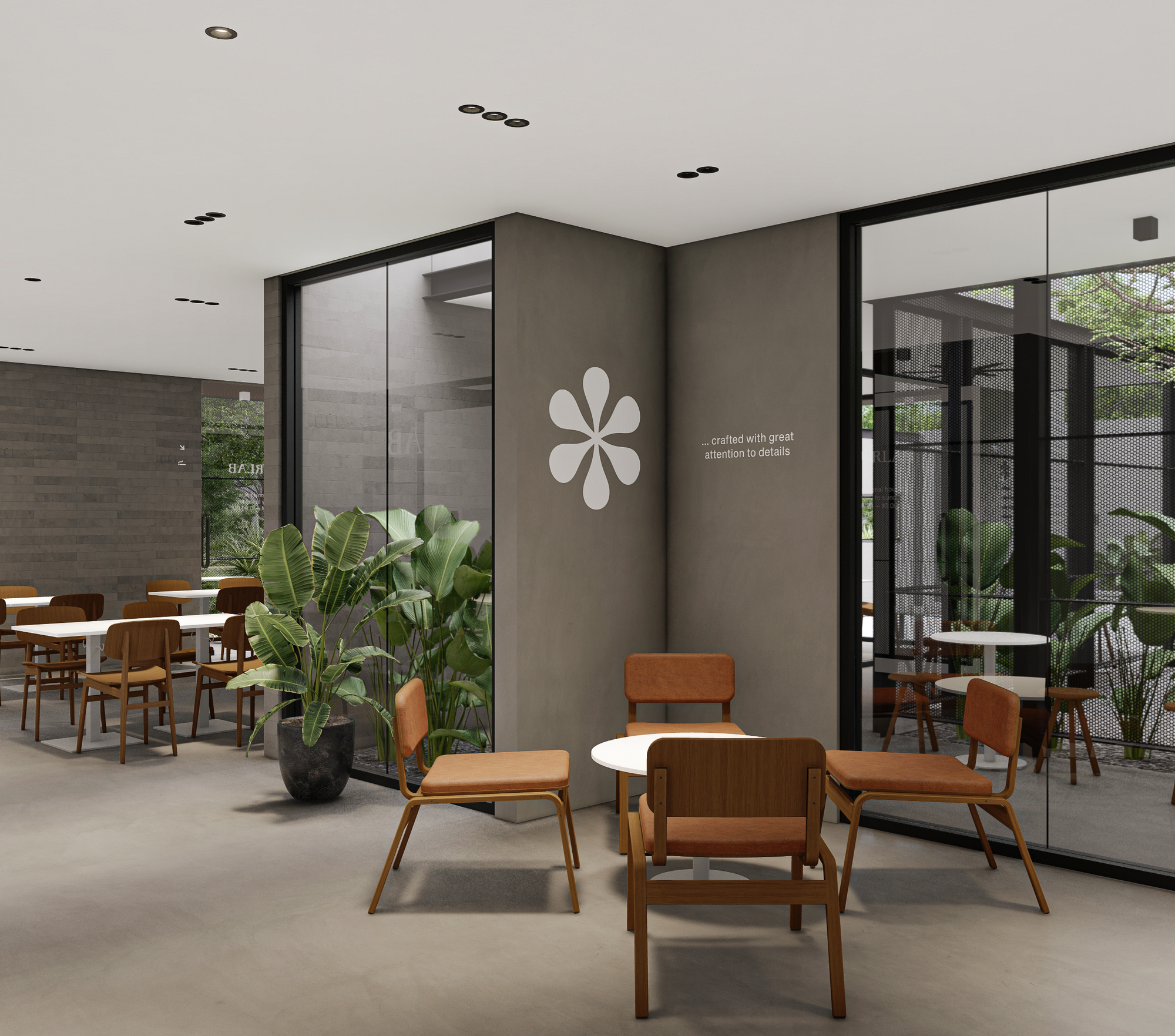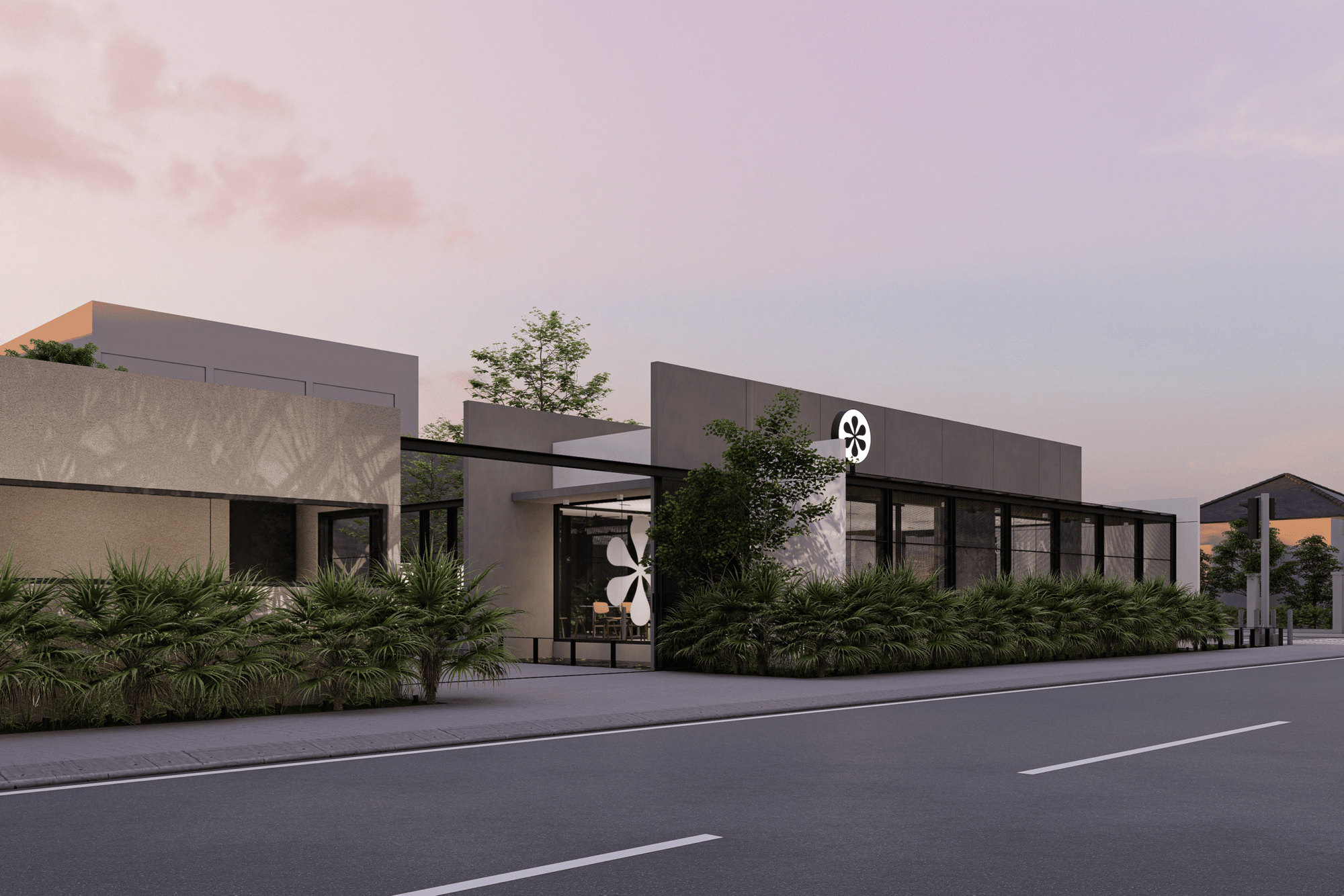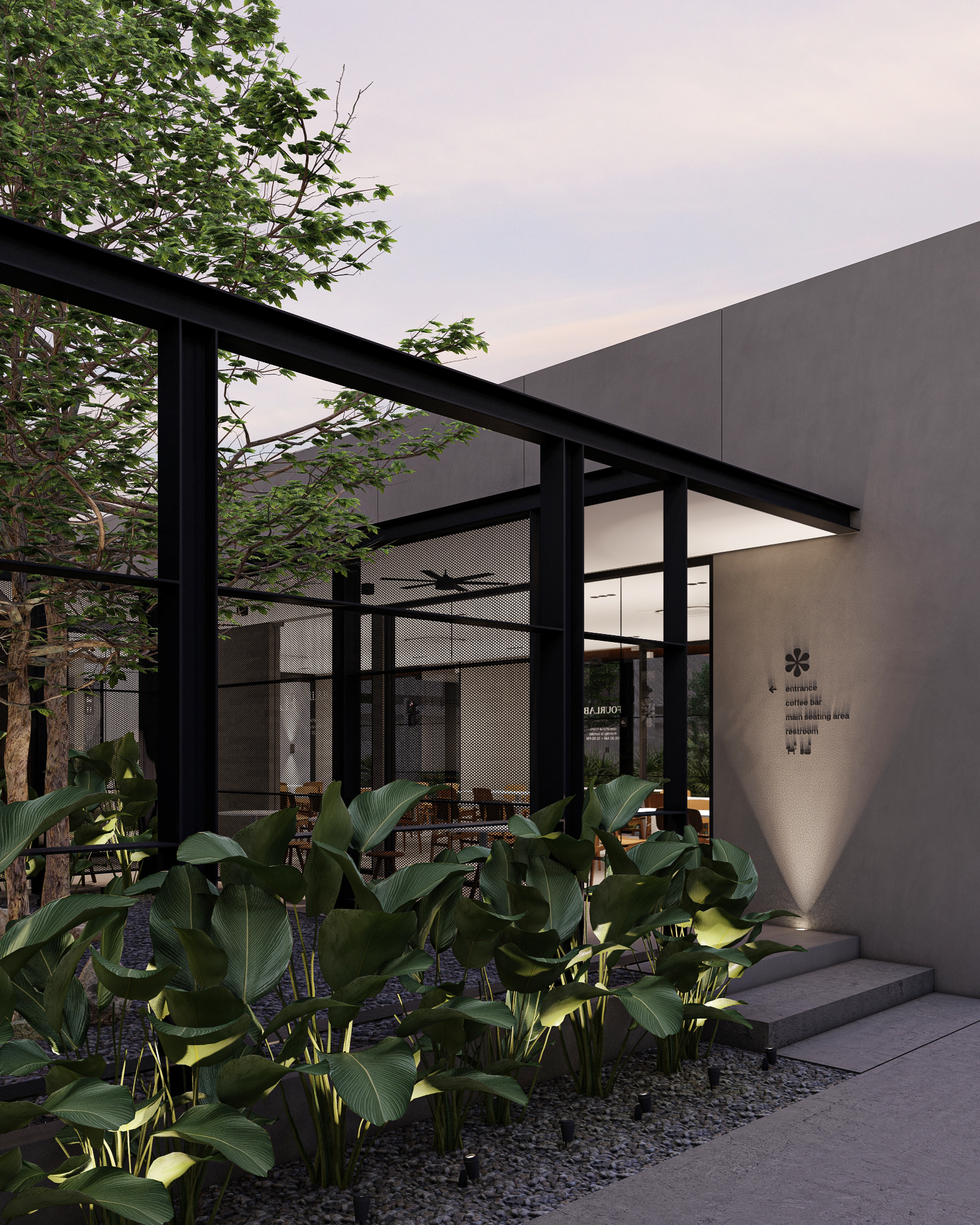 Fourlab dirancang sebagai sebuah ruang kopi kontemporer yang tumbuh dari pertemuan antara kesederhanaan bentuk, kejujuran material, dan kehangatan suasana tropis urban. Terletak di sudut persimpangan jalan, bangunan ini memanfaatkan posisi hook sebagai peluang untuk menghadirkan dua wajah arsitektur yang sama kuatnya, terbuka namun tetap terkontrol. Massa bangunan yang rendah dan horizontal memberi kesan membumi, seolah menyatu dengan ritme kota di sekitarnya tanpa kehilangan identitasnya.