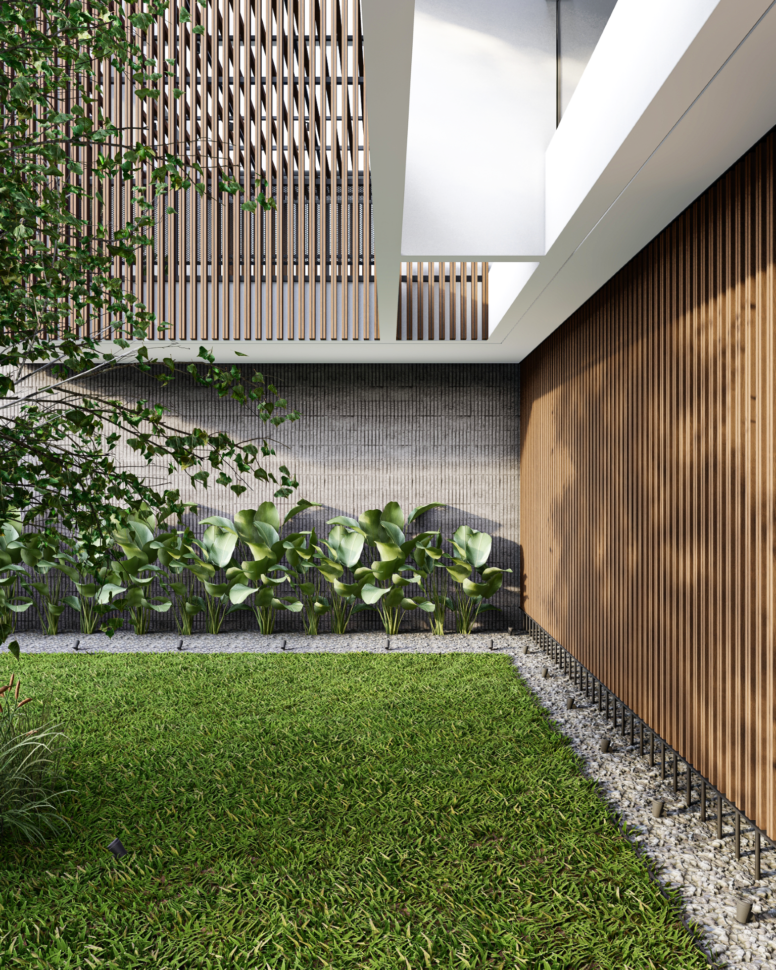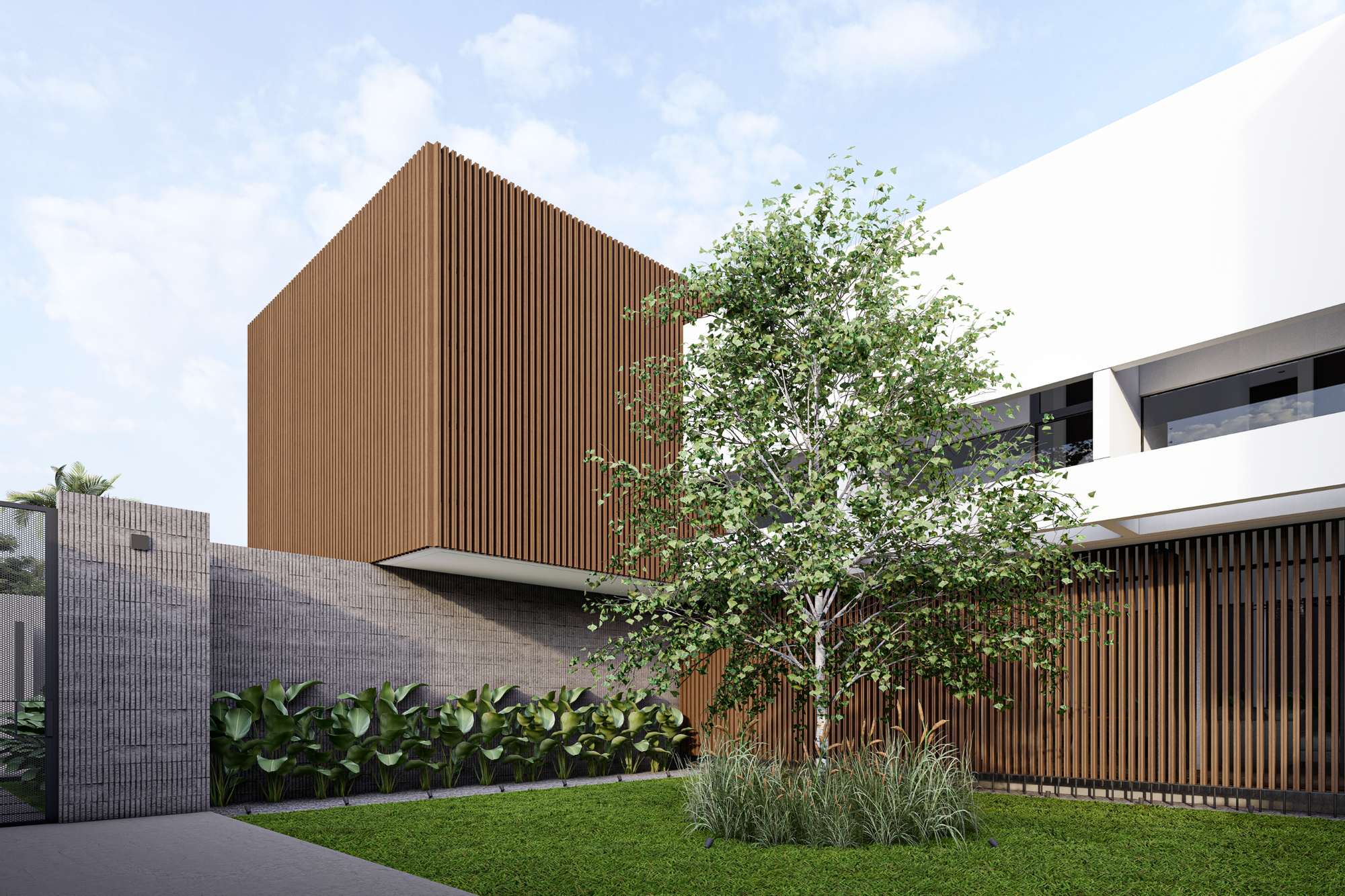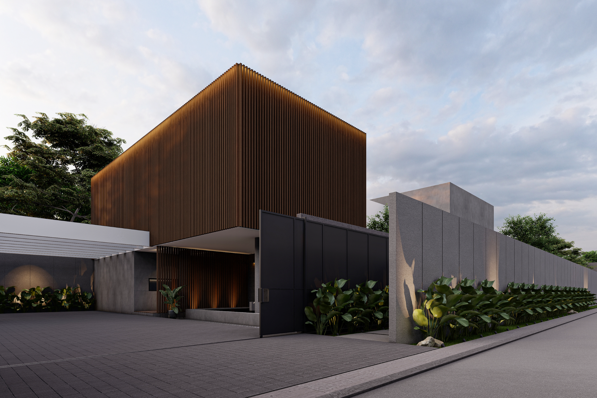 House by The Garden dirancang sebagai sebuah eksplorasi arsitektur kontemporer yang mengedepankan ketenangan, privasi, dan keterhubungan dengan alam. Dari tampilan fasad depan, bangunan ini langsung memperlihatkan komposisi massa yang tegas namun tetap bersahaja, memadukan elemen beton ekspos, bidang putih yang bersih, serta kisi-kisi kayu vertikal yang hangat. Keseluruhan komposisi tersebut membentuk ekspresi arsitektur yang modern, berkarakter, dan tidak berlebihan.
