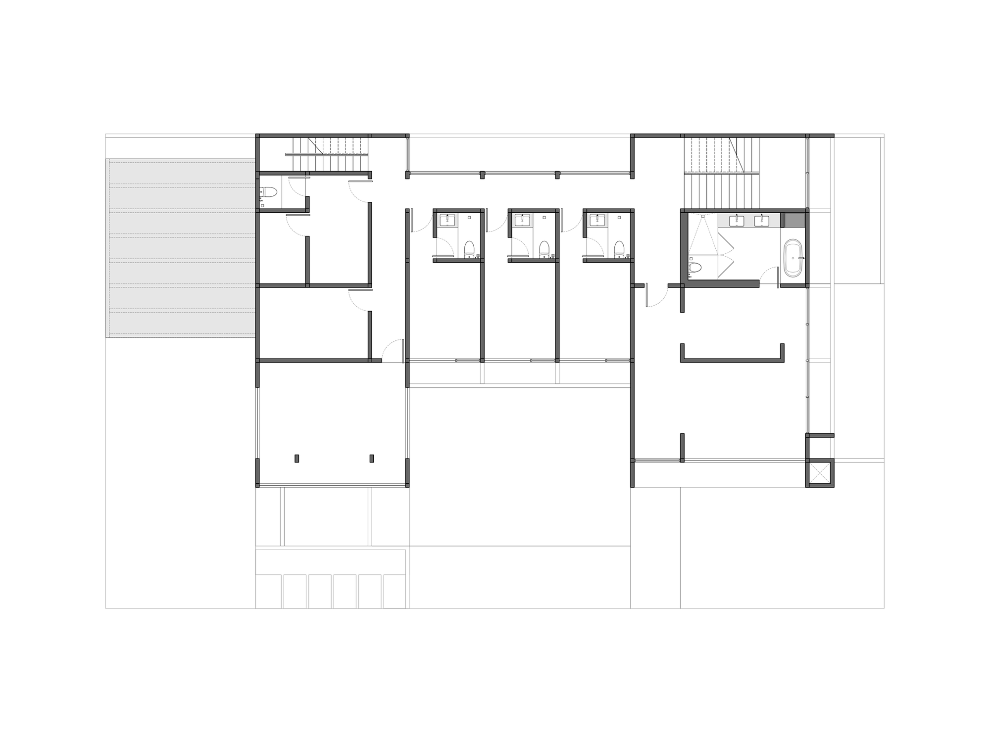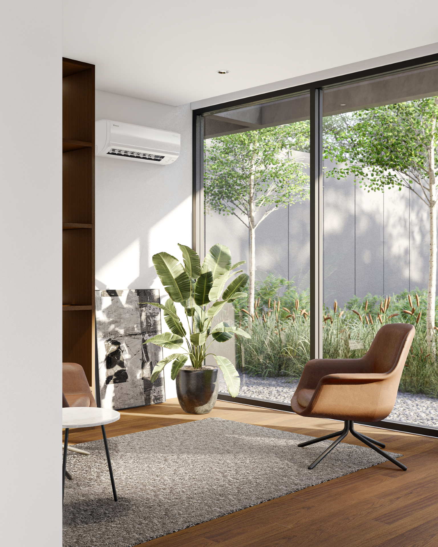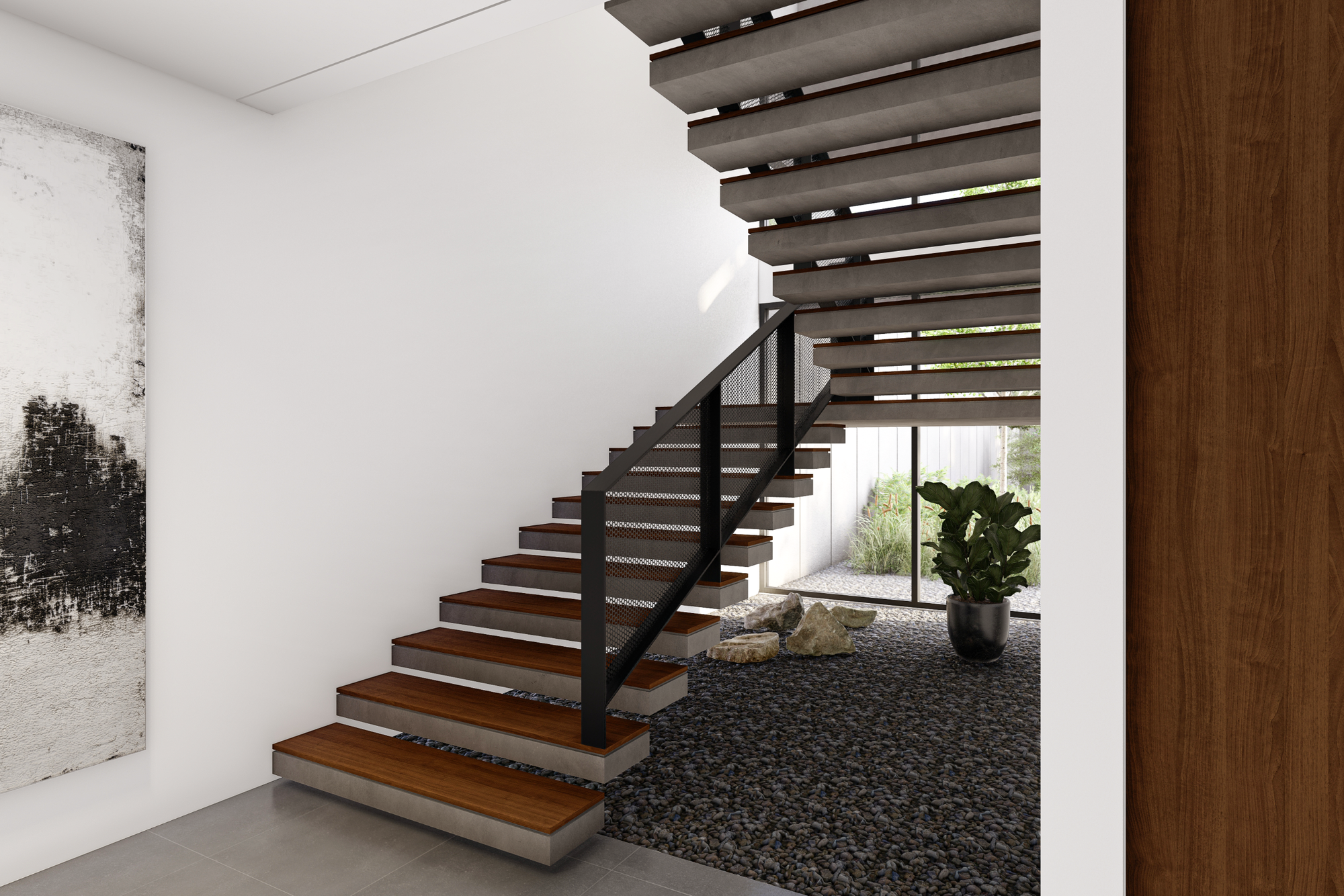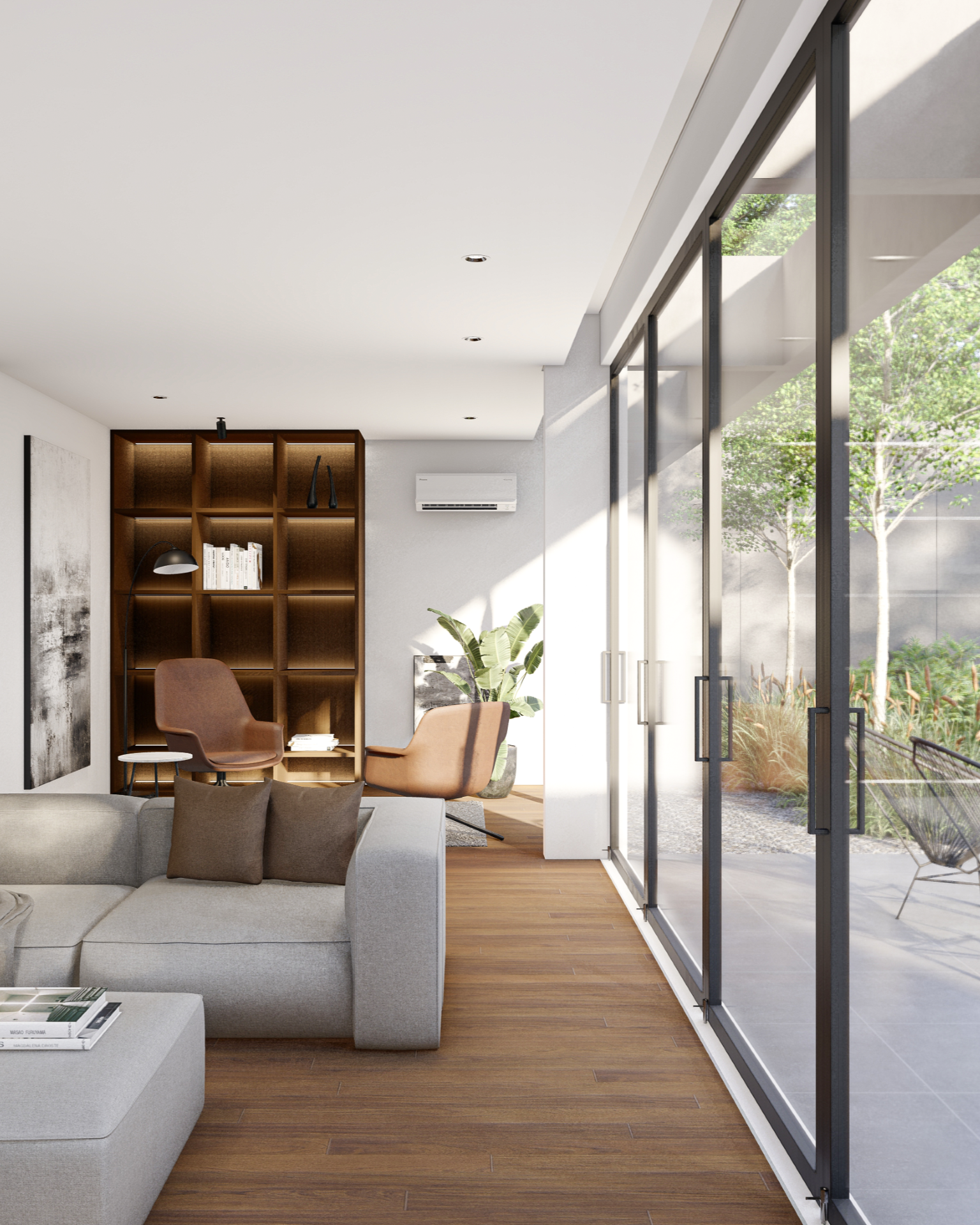 House by The Garden dirancang sebagai sebuah eksplorasi arsitektur kontemporer yang mengedepankan ketenangan, privasi, dan keterhubungan dengan alam. Dari tampilan fasad depan, bangunan ini langsung memperlihatkan komposisi massa yang tegas namun tetap bersahaja, memadukan elemen beton ekspos, bidang putih yang bersih, serta kisi-kisi kayu vertikal yang hangat. Keseluruhan komposisi tersebut membentuk ekspresi arsitektur yang modern, berkarakter, dan tidak berlebihan.
