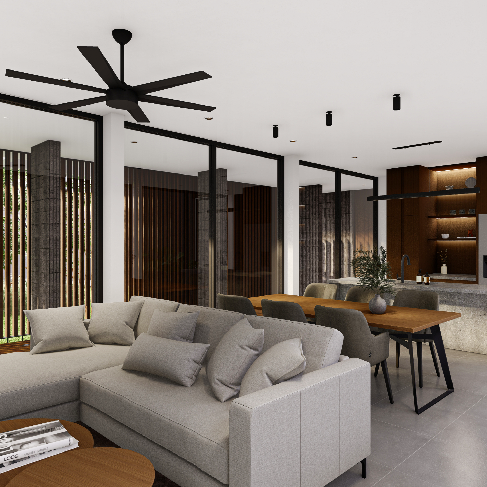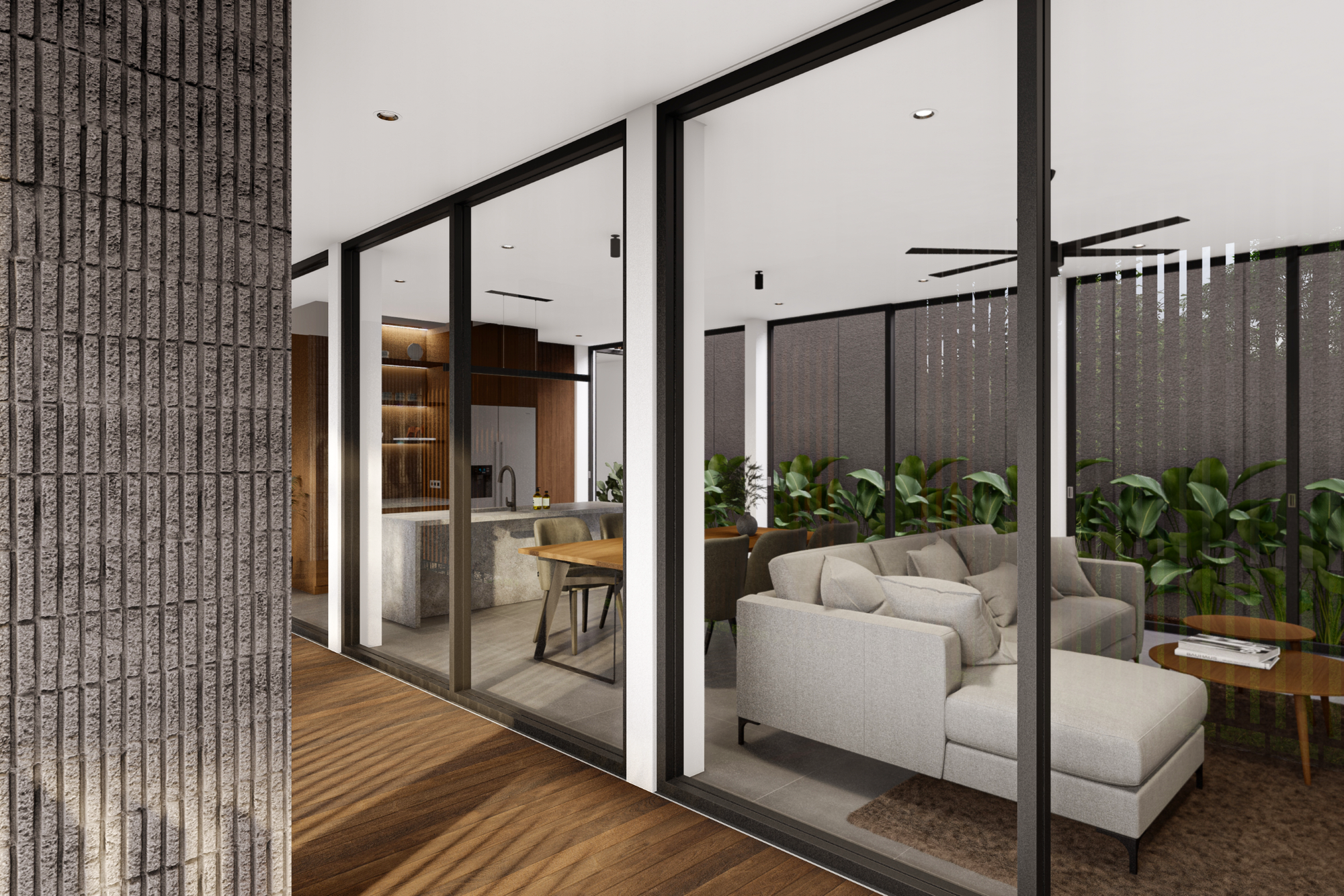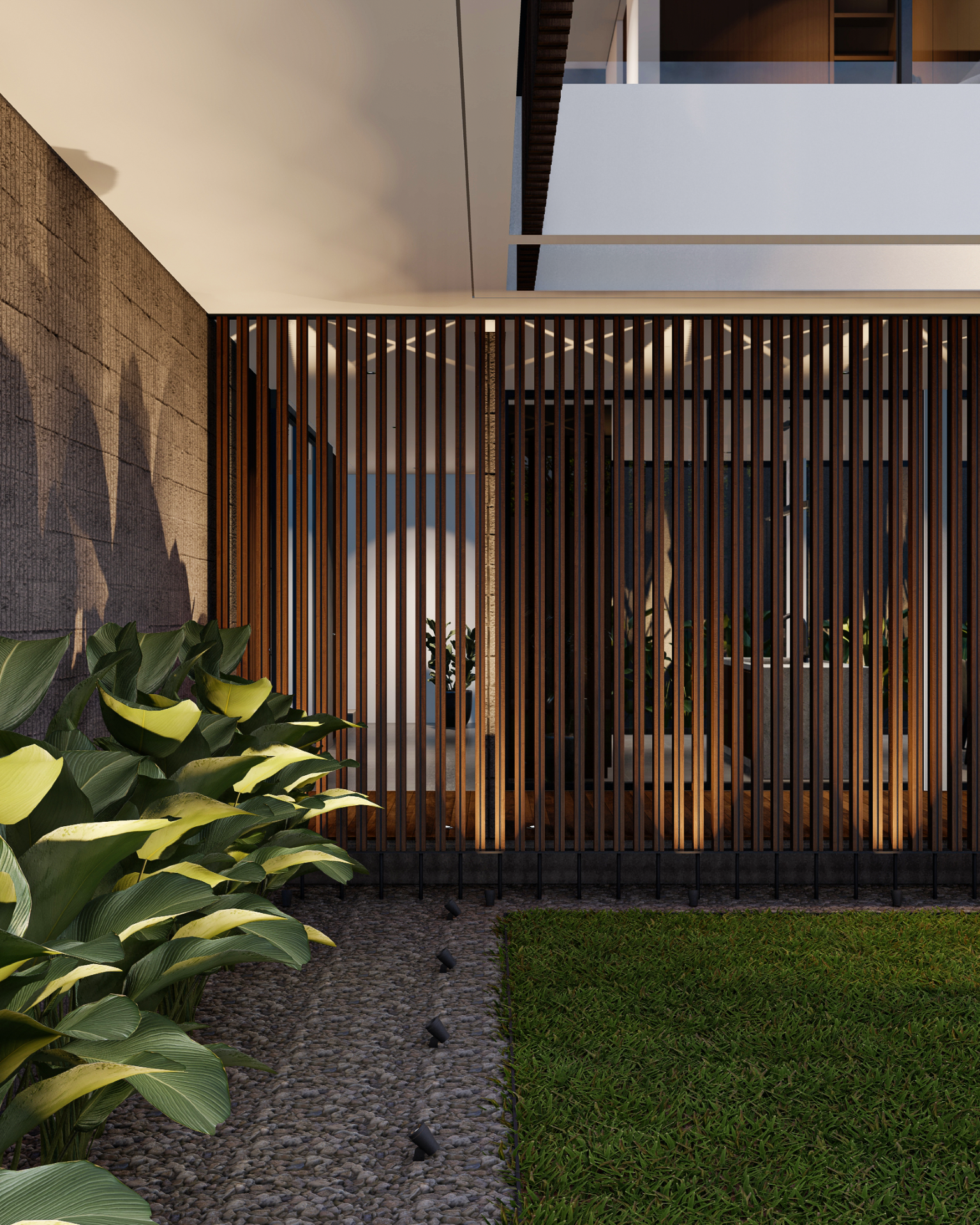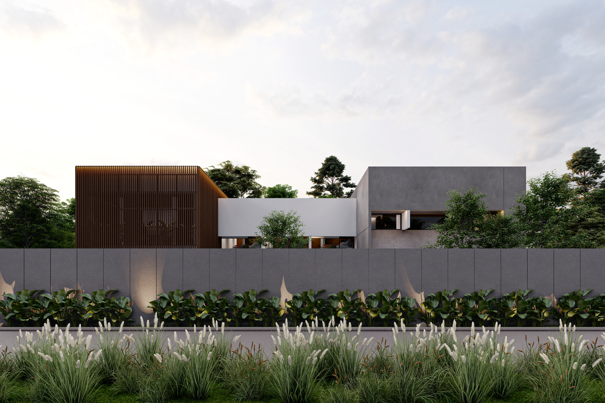 Fasad depan disusun secara berlapis untuk menciptakan transisi visual antara ruang publik dan ruang privat. Dinding perimeter beton bertekstur berfungsi sebagai pelindung visual sekaligus elemen penegas batas tapak. Di baliknya, vegetasi rendah dan tanaman hias berfungsi melembutkan kesan masif dinding serta menciptakan pengalaman visual yang lebih natural bagi pejalan kaki maupun penghuni.