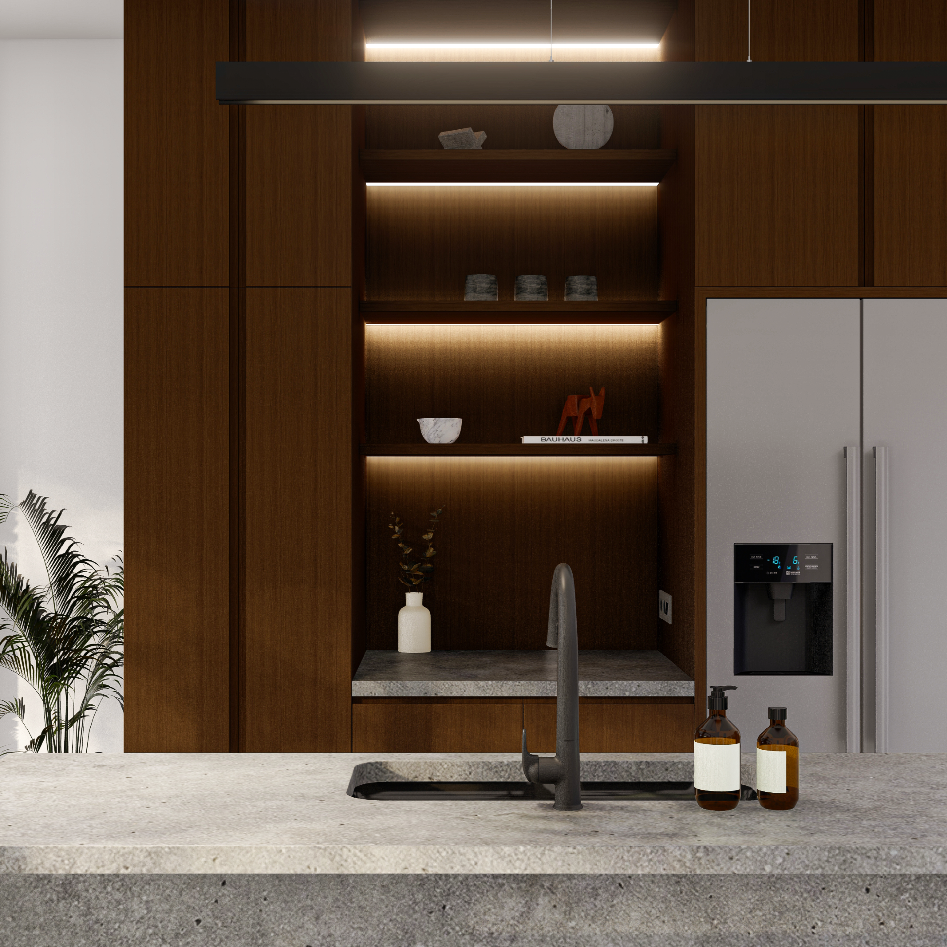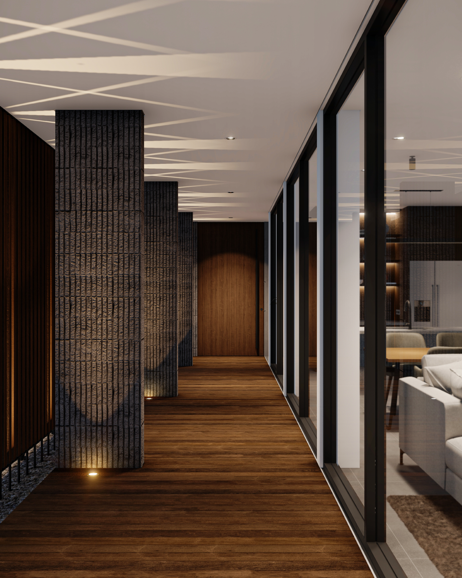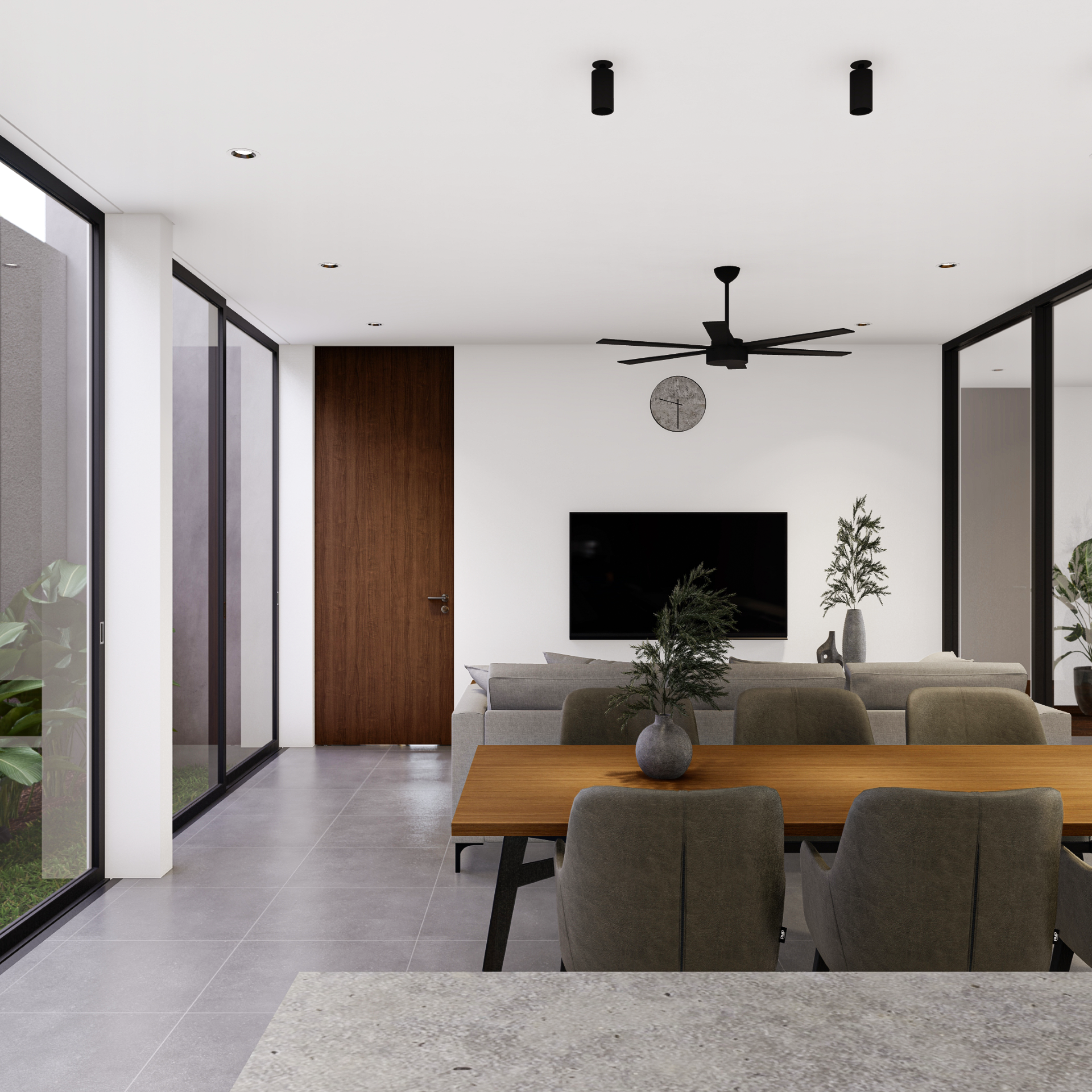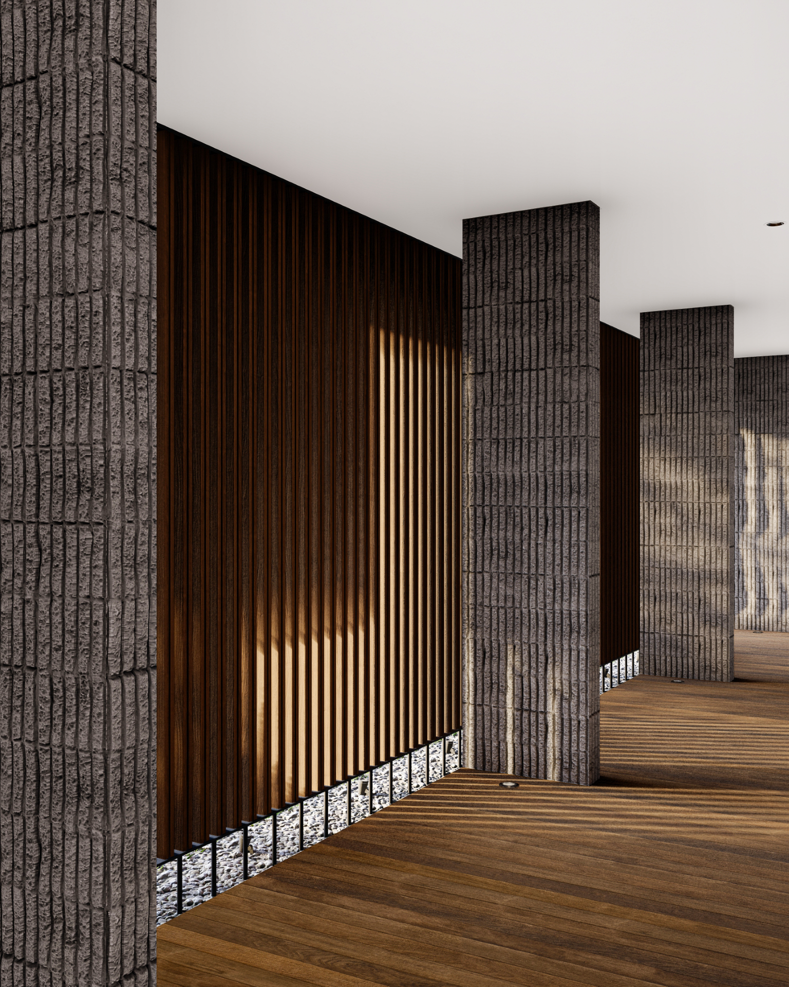 Fasad depan disusun secara berlapis untuk menciptakan transisi visual antara ruang publik dan ruang privat. Dinding perimeter beton bertekstur berfungsi sebagai pelindung visual sekaligus elemen penegas batas tapak. Di baliknya, vegetasi rendah dan tanaman hias berfungsi melembutkan kesan masif dinding serta menciptakan pengalaman visual yang lebih natural bagi pejalan kaki maupun penghuni.