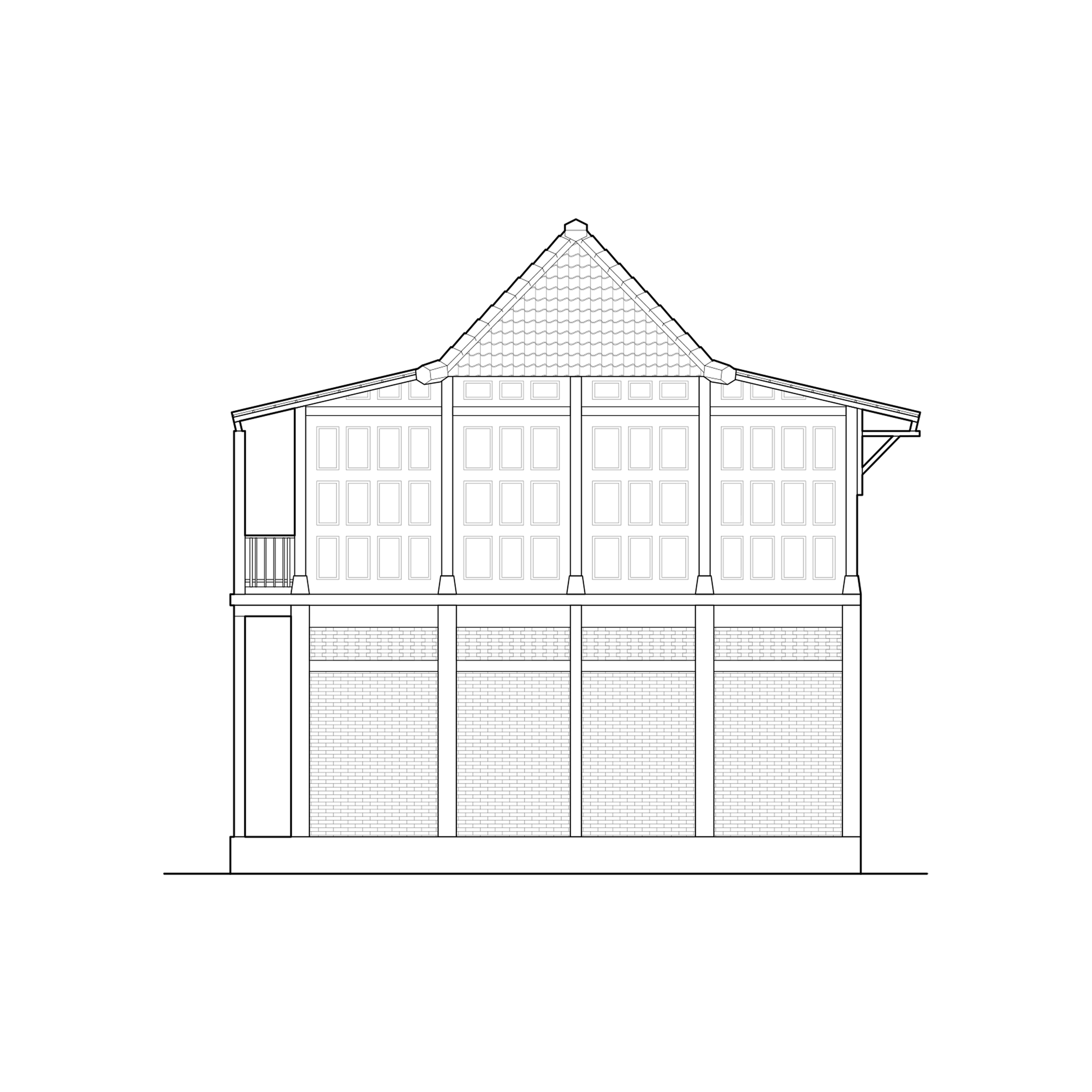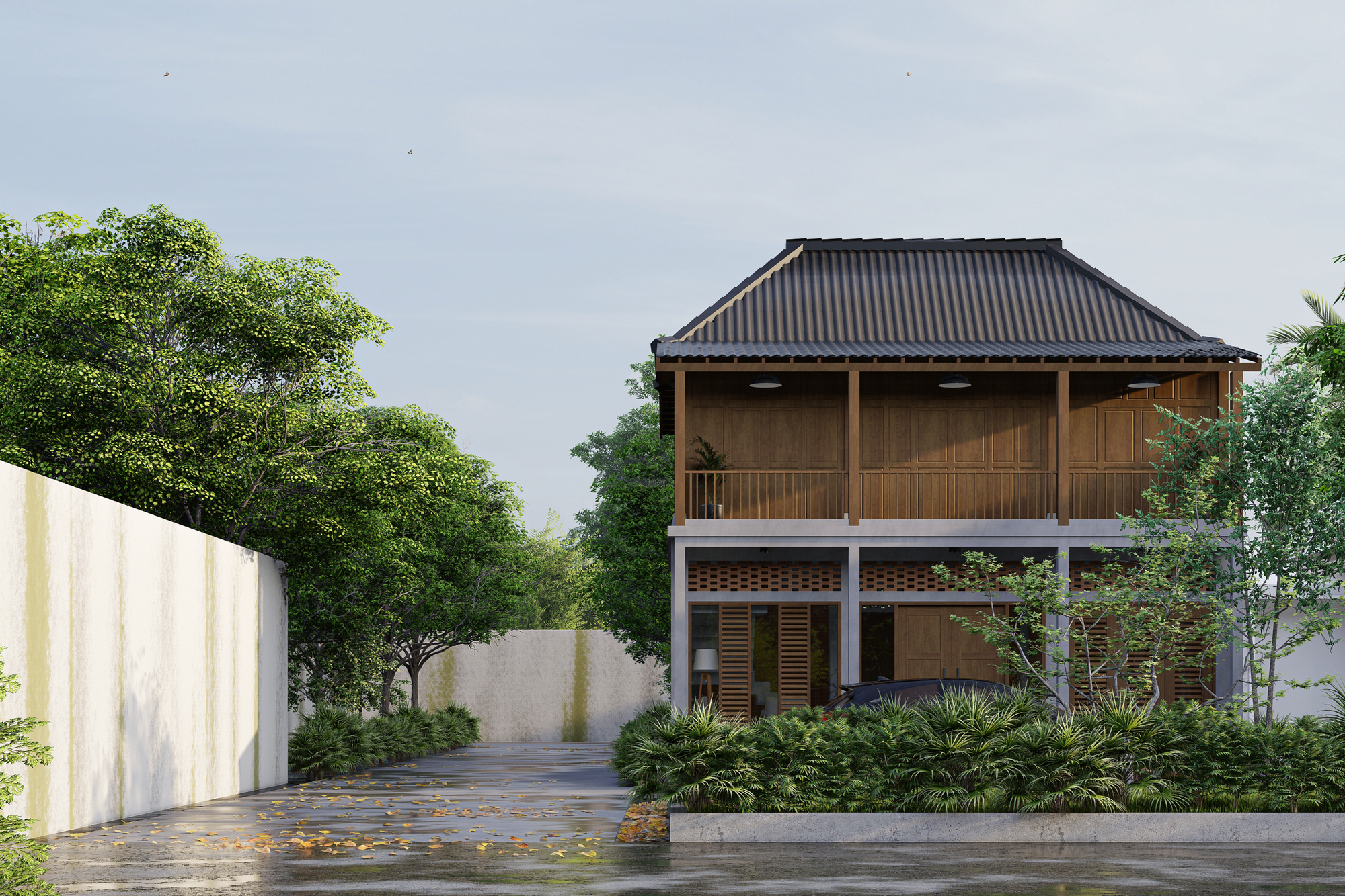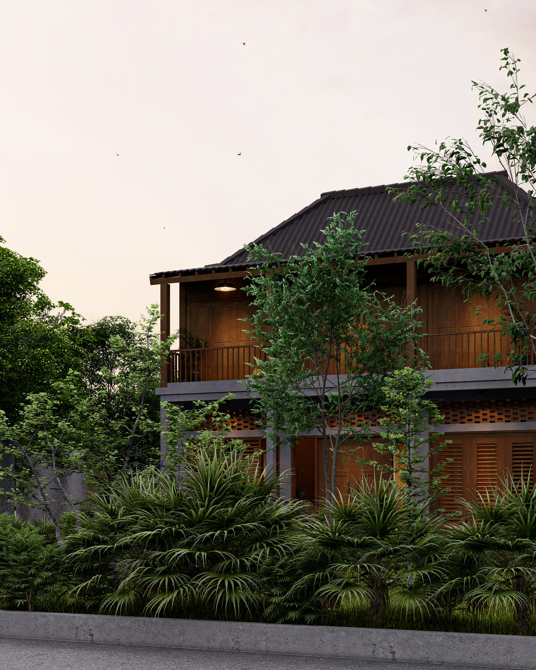 Proyek ini merupakan sebuah eksplorasi arsitektural yang menggabungkan nilai-nilai tradisional dengan pendekatan tropis modern. Pemilik rumah memiliki keinginan kuat untuk mempertahankan Omah Gebyok, sebuah elemen arsitektur khas Jawa yang kaya akan nilai historis dan estetika. Sebagai bentuk pelestarian budaya sekaligus adaptasi terhadap kebutuhan ruang yang kontemporer, Omah Gebyok kemudian diangkat menjadi lantai atas rumah ini. Hal ini tidak hanya menjadi simbol penghormatan terhadap warisan leluhur, tetapi juga menciptakan karakter yang kuat bagi tampilan bangunan secara keseluruhan.
