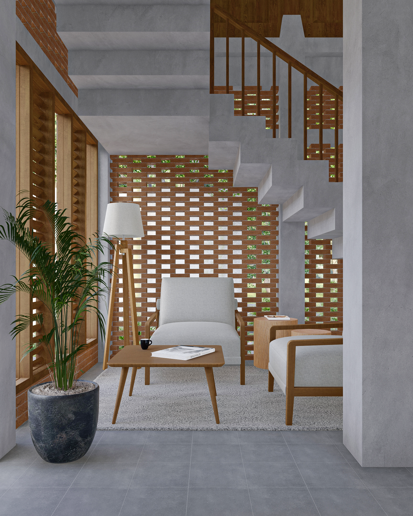 Desain rumah ini menonjolkan elemen kayu dari Omah Gebyok sebagai penekanan utama pada lantai dua. Panel-panel kayu yang digunakan mempertahankan ukiran tradisional dengan detail halus, menciptakan suasana hangat dan penuh nostalgia. Di sisi lain, lantai dasar dirancang dengan pendekatan tropis yang fungsional, menggunakan elemen ekspos seperti beton dan susunan bata merah terbuka (open brick arrangement). Dinding bata terbuka ini tidak hanya memberikan tekstur visual yang menarik, tetapi juga memungkinkan terjadinya sirkulasi udara silang (cross ventilation) yang optimal di dalam ruang, menciptakan iklim mikro yang nyaman tanpa tergantung sepenuhnya