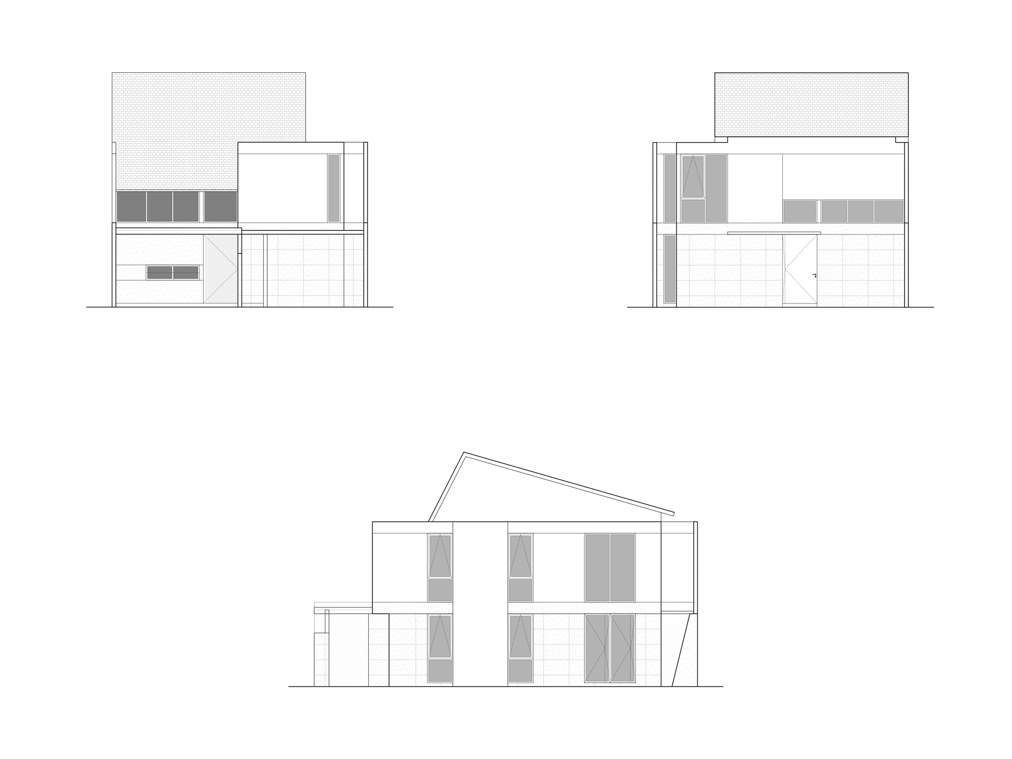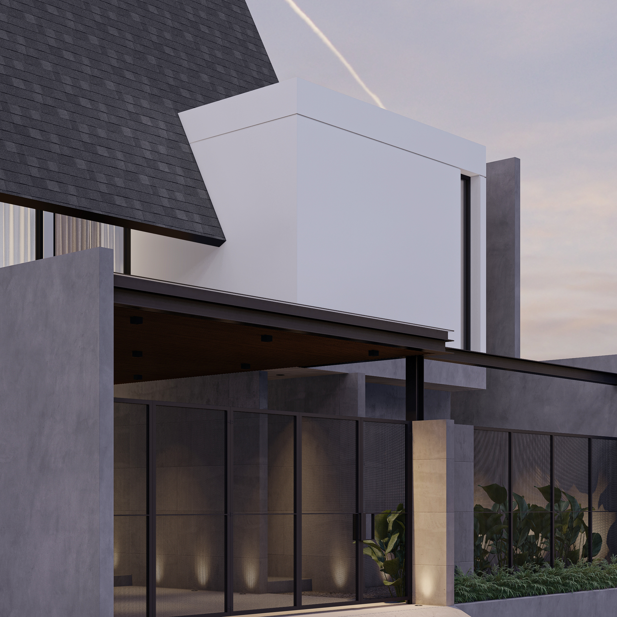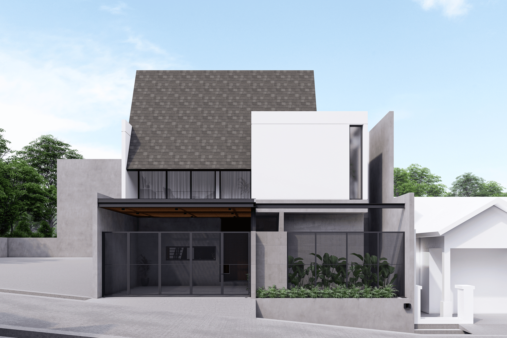 Fasad depan menampilkan perpaduan massa berbentuk segitiga pada atap miring dengan volume kotak berwarna putih yang lebih tegas dan minimalis. Atap pelana berlapis material bertekstur abu-abu gelap memberikan kesan kokoh sekaligus membingkai area lantai dua yang lebih privat. Sementara itu, volume putih di sisi kanan menjadi aksen kontras yang memperkuat komposisi geometris bangunan. Keseimbangan ini menciptakan siluet yang bersih namun tetap dinamis.