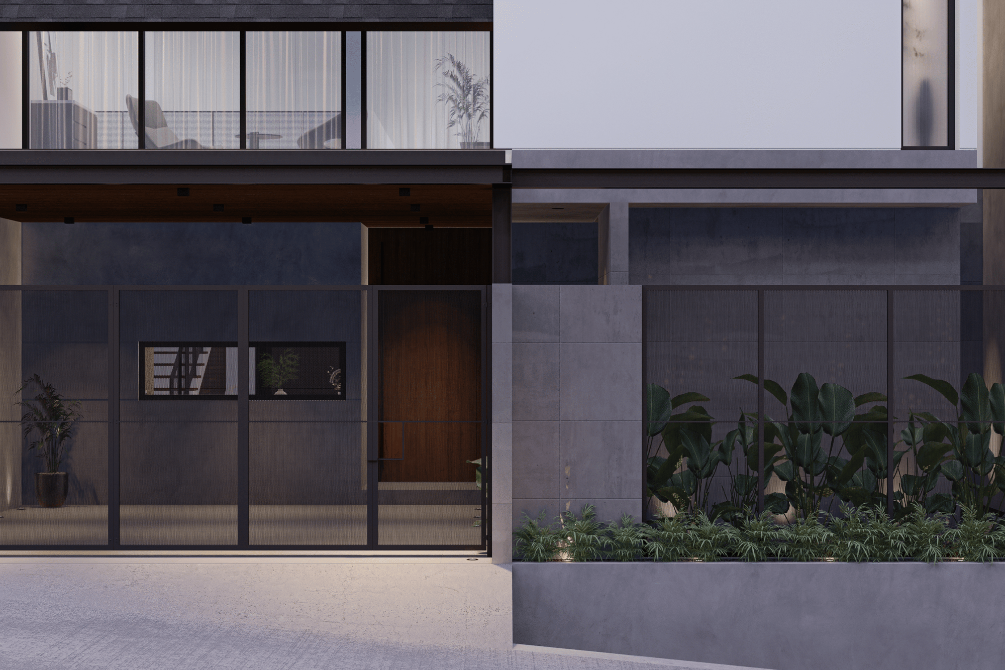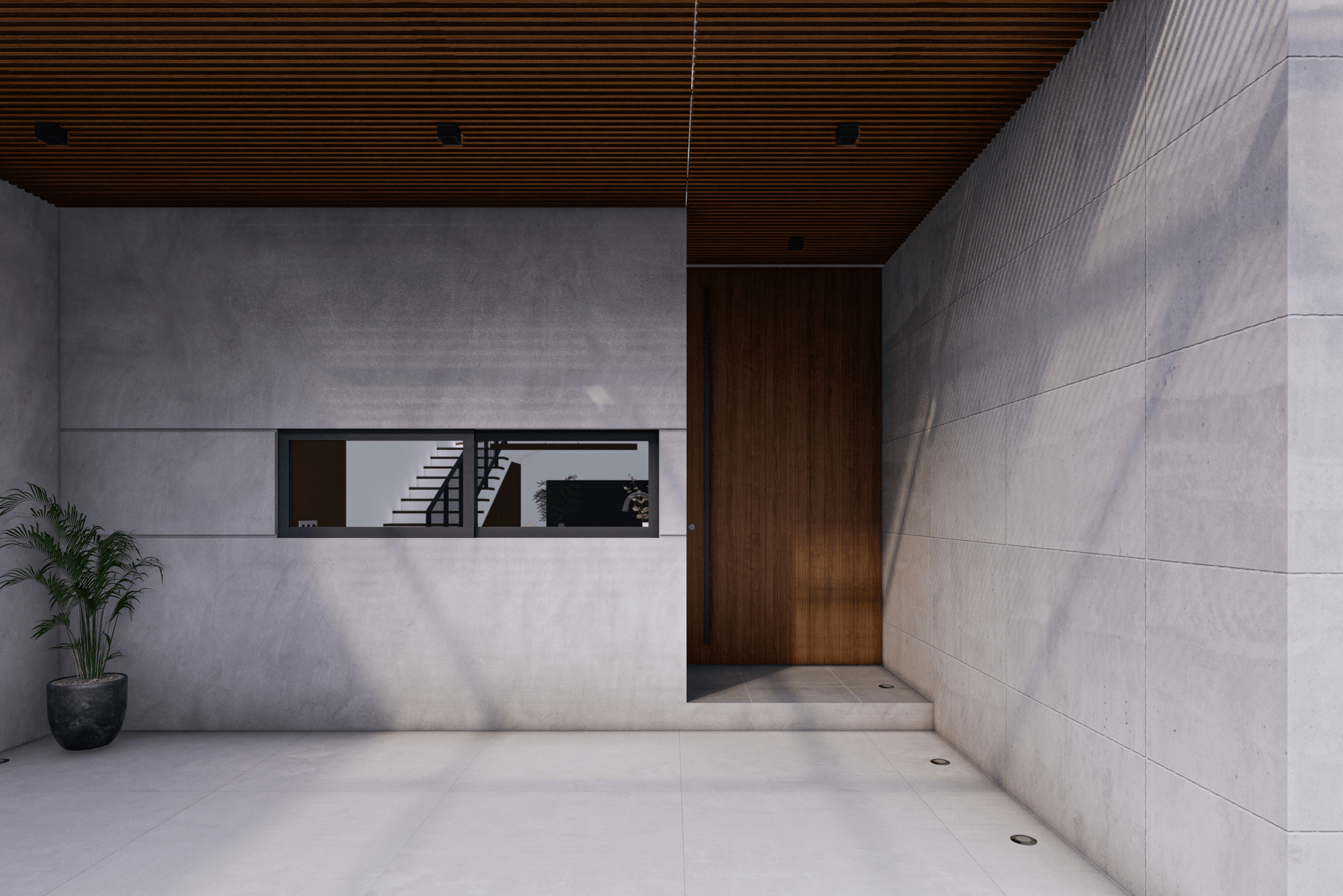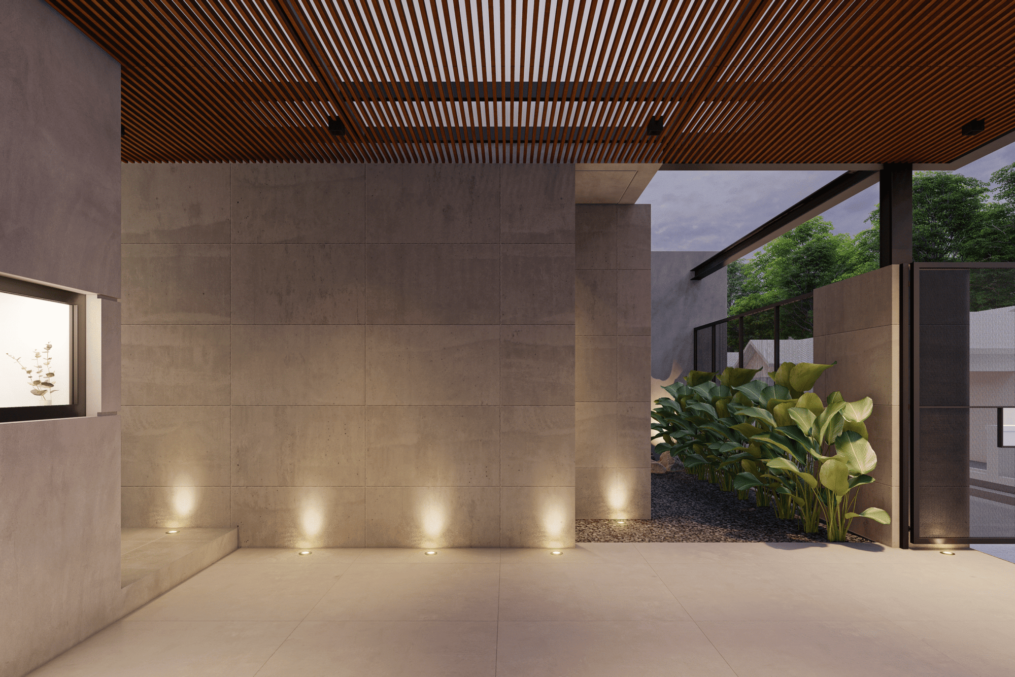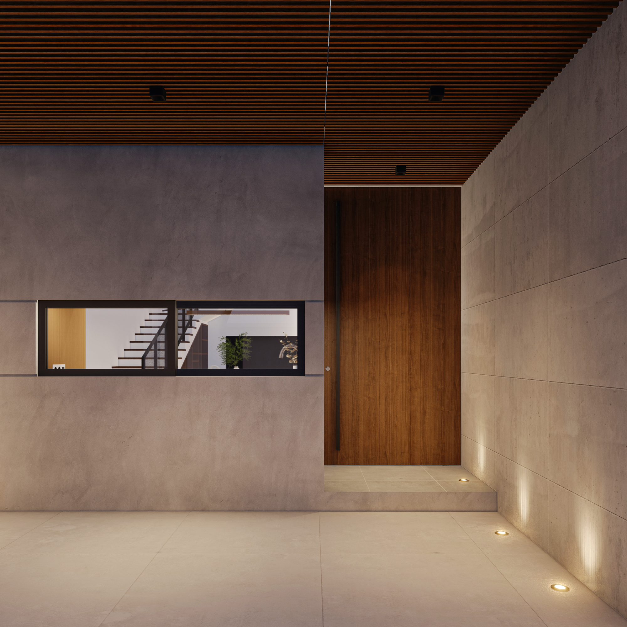 Proyek hunian ini dirancang sebagai respons terhadap konteks tapak yang berada pada kontur menurun, dengan pendekatan arsitektur modern tropis yang menekankan kesederhanaan bentuk, kejujuran material, dan pengolahan ruang yang efisien. Bangunan tampil sebagai komposisi massa yang tegas namun tetap hangat, memadukan elemen solid dan transparan untuk menciptakan keseimbangan antara privasi dan keterbukaan. Melalui permainan volume dan tekstur, rumah ini menghadirkan identitas yang kuat sekaligus menyatu dengan lingkungan sekitar.