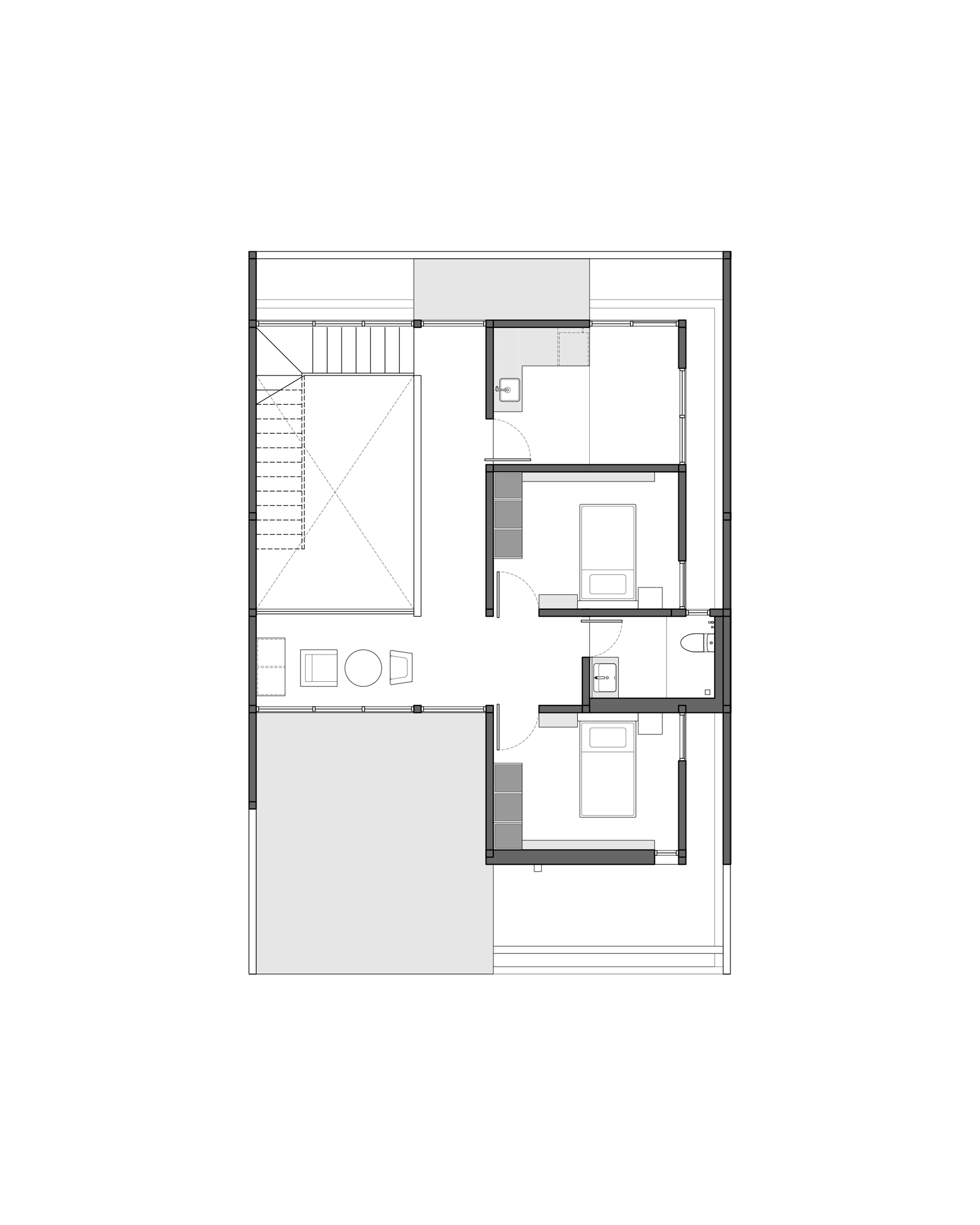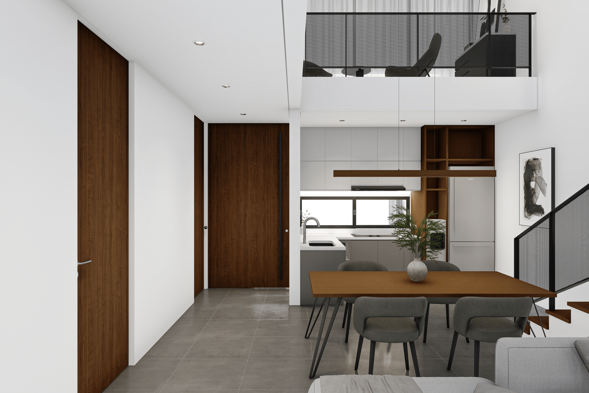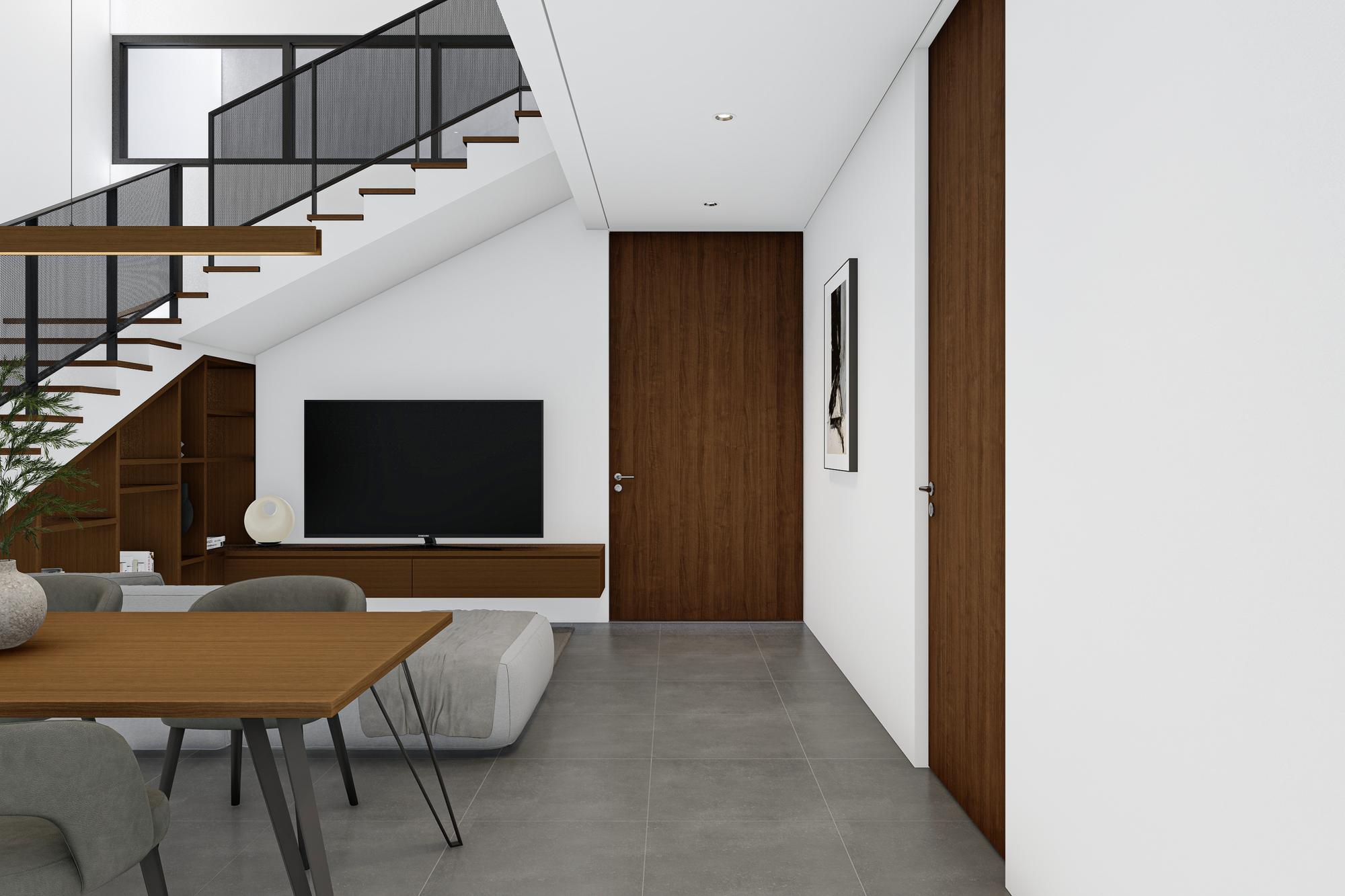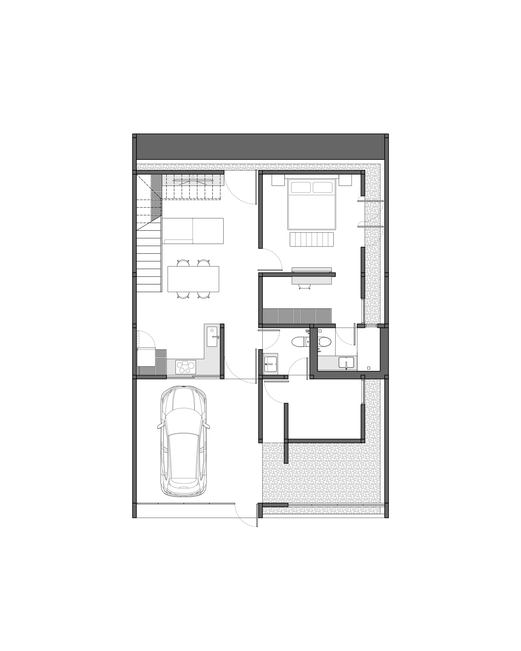 Proyek hunian ini dirancang sebagai respons terhadap konteks tapak yang berada pada kontur menurun, dengan pendekatan arsitektur modern tropis yang menekankan kesederhanaan bentuk, kejujuran material, dan pengolahan ruang yang efisien. Bangunan tampil sebagai komposisi massa yang tegas namun tetap hangat, memadukan elemen solid dan transparan untuk menciptakan keseimbangan antara privasi dan keterbukaan. Melalui permainan volume dan tekstur, rumah ini menghadirkan identitas yang kuat sekaligus menyatu dengan lingkungan sekitar.